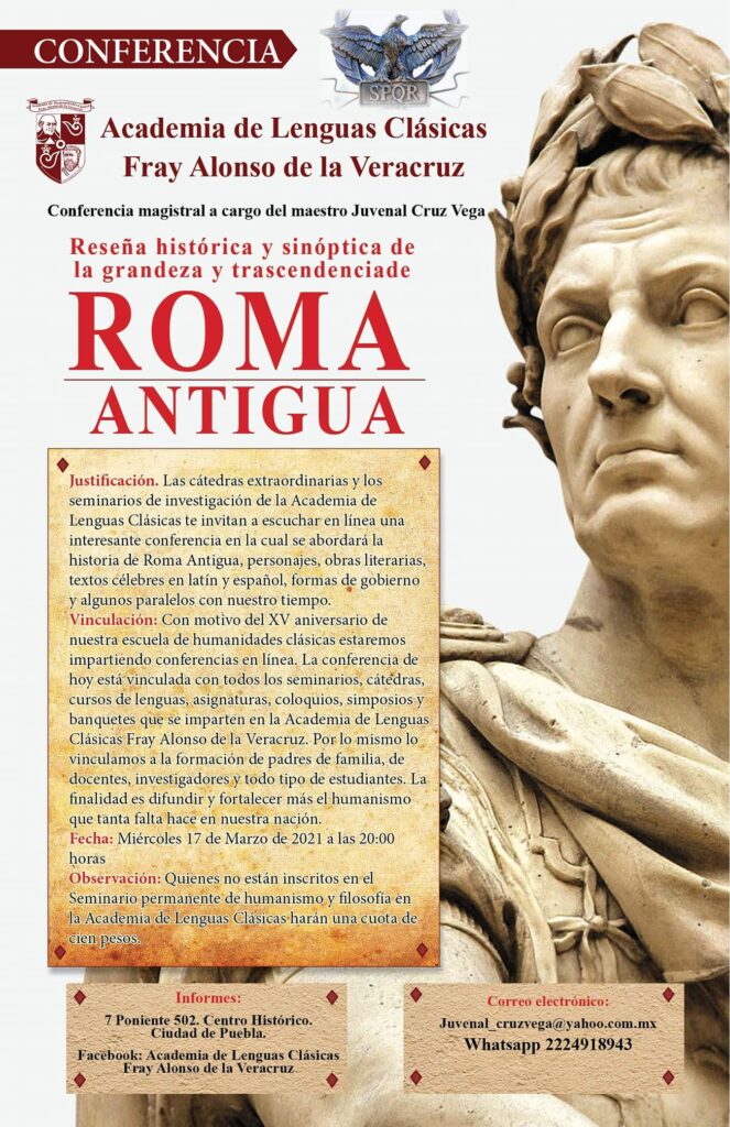 La Academia de Lenguas Clásicas Fray Alonso de la Veracruz invita a la conferencia magistral sobre Roma Antigua. Celebrando el XV aniversario de la Academia de Lenguas Clásicas Fray Alonso de la Veracruz. Hoy miércoles 17 marzo de 2021 a las 8 de la noche.