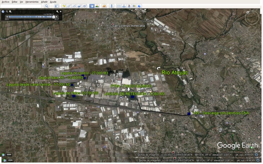 Un funcionario de la CONAGUA entonces, que mantenemos en el anonimato por así convenir a sus intereses, nos cuenta la historia: “Melquiades Morales Flores era el gobernador. Francisco Castillo Montemayor era el director del SOAPAP, y apenas unos meses antes se habían inaugurado las plantas de tratamiento. CNA y SOAPAP tenían establecido un mecanismo de vigilancia del Atoyac para que no hubiera reclamos de que no operaban. La gente reportaba el color del río, y cuando veía algo rojo, verde, del color que fuera, luego, luego avisaban al área de calidad del agua del SOAPAP. Ellos iban, tomaban fotos y las mandaban a Conagua. Las plantas se construyeron entre el 2001 y el 2002. Tenía que notarse la mejora. Si no, culpa del SOAPAP, así que en cuanto pasaba algo raro, avisaban. Ellos, los del SOAPAP, nos avisaban. Así que, corriendo, vamos a ver, y vimos que esa descarga era de Volkswagen.”