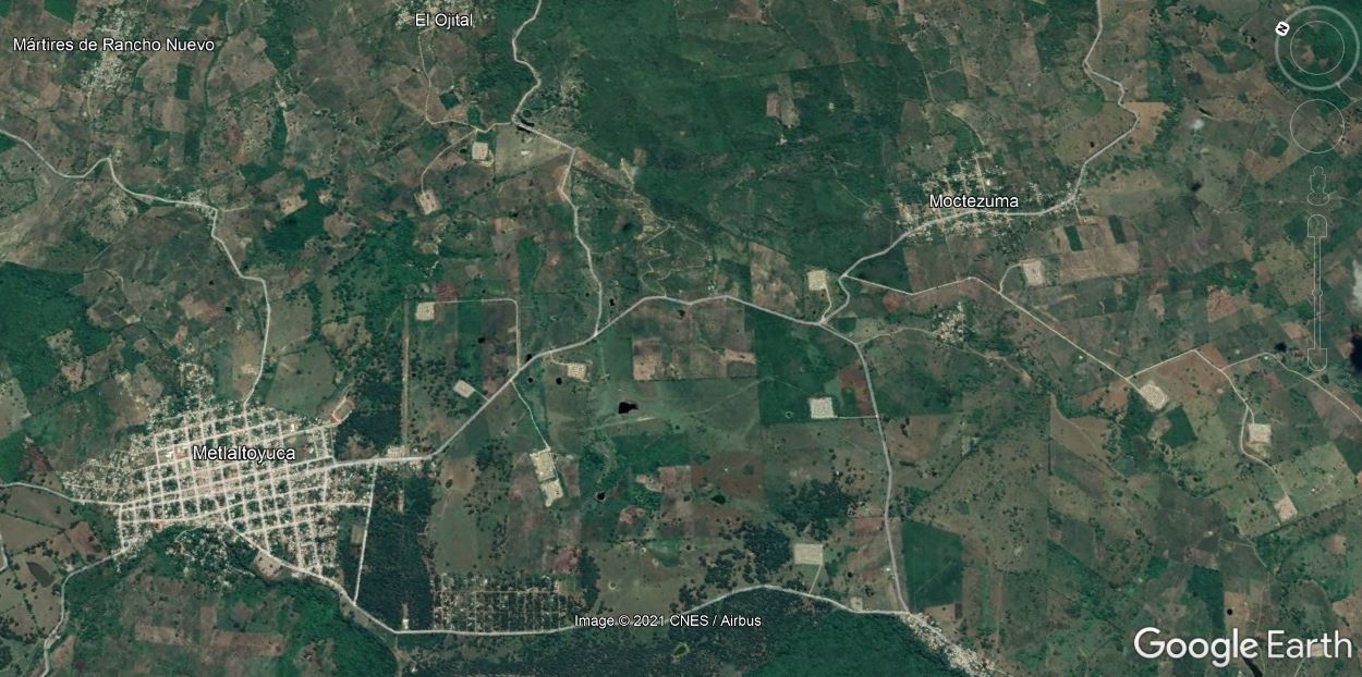 A la izquierda, el poblado de Metlaltoyuca, en un punto de la meseta tropical que lleva su nombre, en el punto extremo del estado de Puebla. Los cuadros blancos son los campos petroleros abiertos por PEMEX en los primeros años de este siglo. Sobre este territorio, la amenza del fracking.