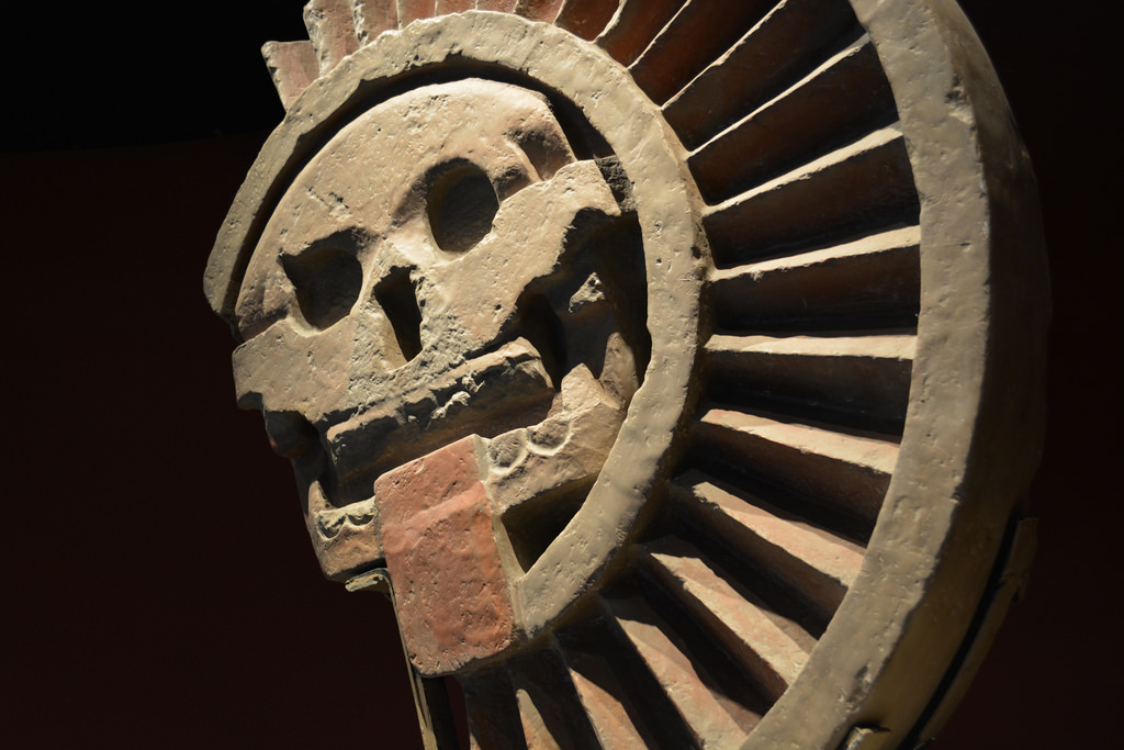 Un testimonio arqueológico de esto es el sol con el rostro de la muerte encontrado en Teotihuacan (500 a. C.) frente a la pirámide del sol y orientado hacia el poniente. El sol, símbolo de vida, es una inmensa calavera con la lengua de fuera, es la vida vuelta muerte para ir a alumbrar el mundo de los descarnados, de los que viven bajo la tierra. Durante la noche cruzará el Mictlán, atravesará el interior de la tierra y volverá a salir por el oriente para alumbrar otra vez el mundo de los vivos. Con este sol estamos ya ante una representación cósmica de la intimidad alternada entre la vida y la muerte.