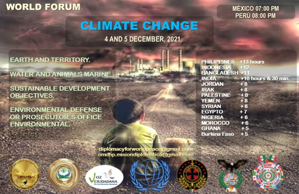 Todo lo anterior es lo que motiva que este 4 y 5 de diciembre, la sociedad civil organizada y no organizada de diversos lugares del mundo, como activistas, defensores del medio ambiente, de la fauna y flora, de los derechos humanos, animalistas, académicos, a través de la Organización Mundial de Derechos Humanos y Paz (OMDHyP) y las diversas organizaciones aliadas como lo son Voz Ciudadana por los Derechos Humanos estemos por realizar el Primer Foro Mundial de Cambio Climático donde se buscará construir desde la ciudadanía, alternativas de solución que rompan con la inercia destructiva que estamos teniendo por nuestro planeta. Por tal razón en nombre de nuestra organización y de su servidor, en mi calidad de director de Derechos Humanos y Paz para América Latina es que los invitamos a que participen en este foro, que sean parte de la agenda conceptual que se va a generar para lograr la supervivencia de la raza humana, pues somos nosotros mismos quienes estamos motivando la destrucción y desaparición de nuestra propia especie, los cuatro grandes temas a tratar en este foro mundial serán: Tierra y Territorio; Agua y Fauna Marina; Objetivos de Desarrollo Sostenible (ODS); y Defensoría por el medio ambiente.