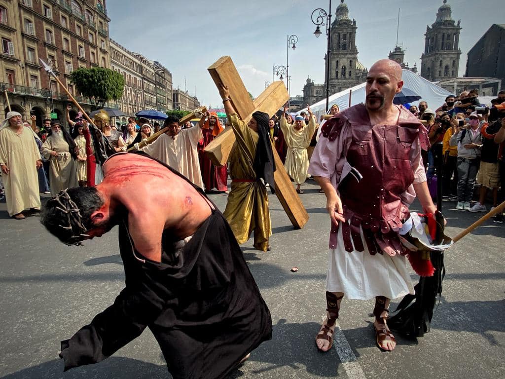 Hoy acompañé a Migue al viacrucis que se presentó en el zócalo de la CDMX. Dicen que es el más antiguo, yo no lo sé; pero la compañía que lo montó lleva 19 años haciéndolo, a excepción de los dos últimos años, que la pandemia lo impidió.