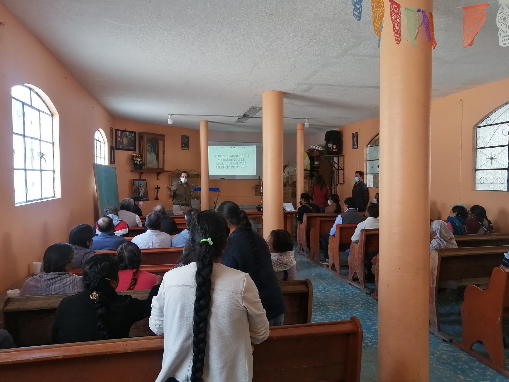 Reunión de trabajo en un salón anexo al templo de San Juan Evangelista. El Doctor Raúl Francisco Pineda expone los detalles del proyecto de conservación. Asisten al Doctor Pineda sus compañeros de la UAQ, la bióloga Clara Margarita Tinoco Navarro y el antropólogo Carlos Dorantes. Están presentes en la reunión las mujeres constructoras, las autoridades del ejido, los fiscales del templo, el párroco Herminio López, el equipo del regidor de Agricultura en el ayuntamiento de Acajete. Y para coordinar la reunión, María Teresa Peral Rascón, Licenciada en Derecho y Ciencias Sociales egresada de la BUAPm especialista en Desarrollo Comunitario, quien ha impulsado desde su inicio el proyecto.
