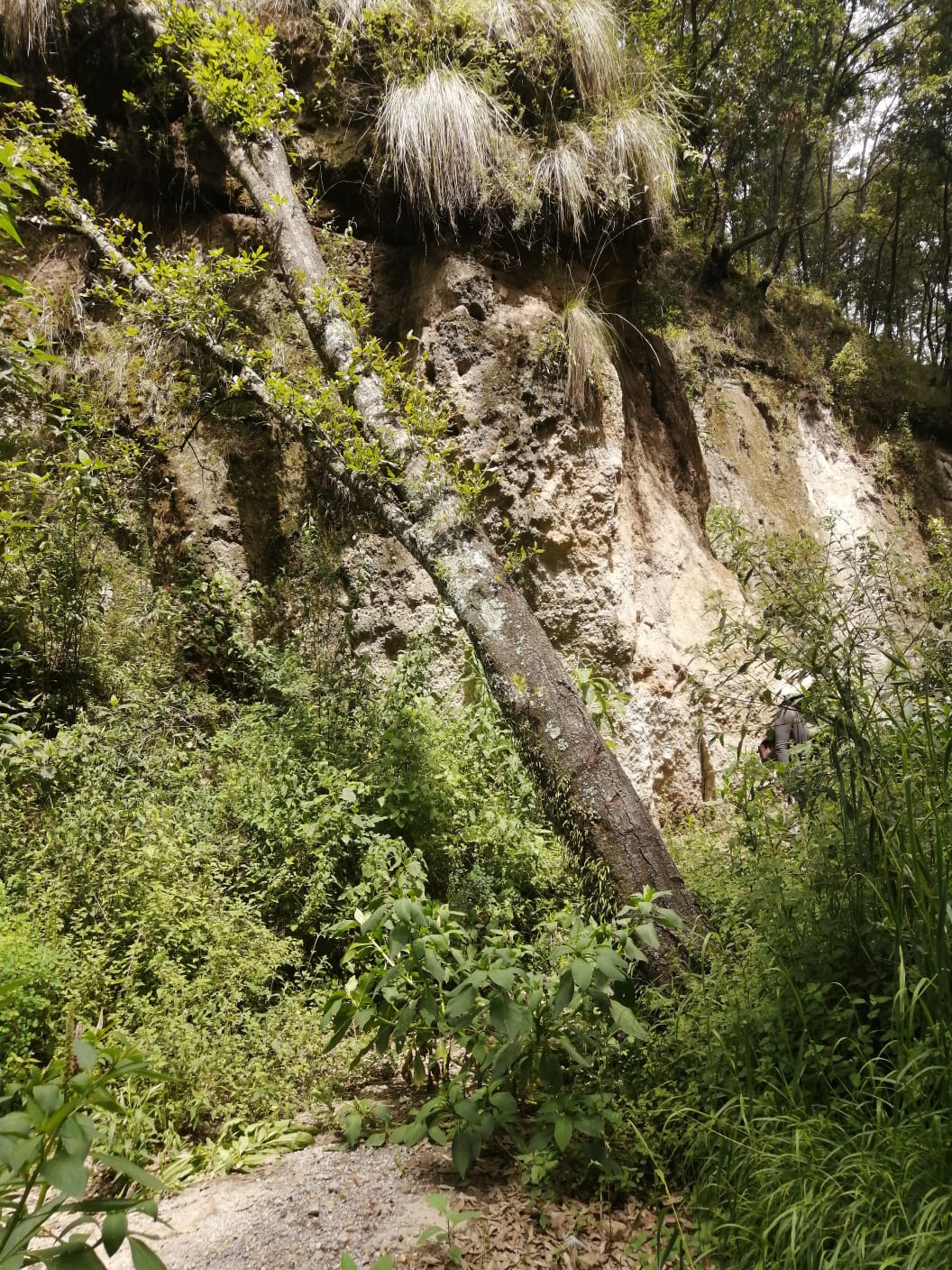 En el recorrido constatamos la devastación que producen las tormentas sobre la barranca. Aquí y allá encontramos los cuerpos enormes de los pinos los pinos y los encinos que se desploman desde el borde superior de la cañada, perdida la consistencia de la tierra en la que enraizan. Unos han muerto y dan paso al festejo de vida que arrastra la pudrición de la madera. Otos resisten recargados contra los paredones pelados, a la espera de una nueva cargada que los arrastre.