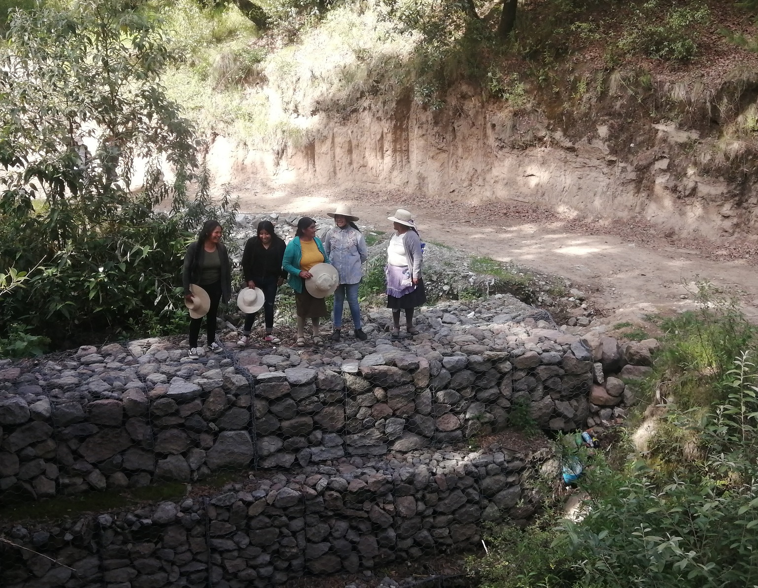 Allá va cada quien con su pala para rascar en el banco de tierra más cercano, ahí mismo, o más lejos, palear y palear, acarrear con la carretilla, rellenar los costales, uno por uno, cincuenta, cien, doscientos. 350 en total. Unas rascan, otras palean, alguien más acarrea, y entre todas rellenan. Y se cansan y se intercambian, y se ríen y se cuentan historias, y trabajan sin reparo alguno. Un día y otro más para amontonar con orden el armatoste de piedras con la idea de armar la trama que de frenar el agua, de contener la tierra que arrastrará el torrente. Las veinticinco pequeñas represas de geo-costales, y una más grande, en abanico, sobre la que cruzará un camino.