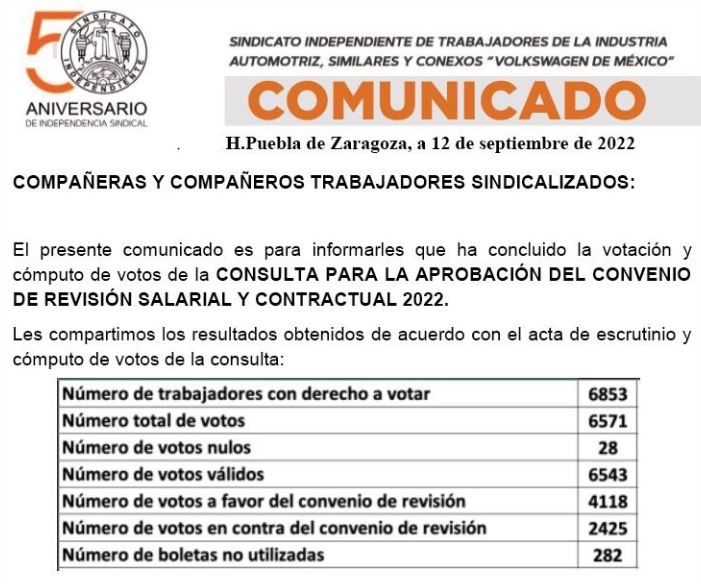 Mundo Nuestro. A la tercera ganó el voto por la aceptación. Dos rechazos previos, los días 5 y 31 de agosto, mantenían abierta la posibilidad de huelga. Esta vez el voto fue contundente, 4,118 votos contra 2,425 y 28 votos nulos de un total de 6571 votos emitidos.