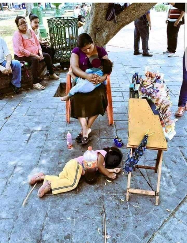 La mujer dormita con el pequeño en el regazo. La niña duerme en el suelo, junto al puesto de cigarros, paletas y cacahuates. Un instante en la vida de una vendedora ambulante en algún parque de la ciudad. Un instante que refleja a una ciudad marcada por la desigualdad social y la pobreza de la mayoría de sus habitantes.