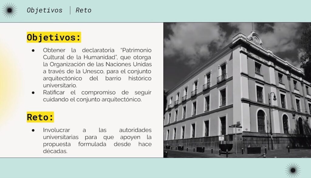A nombre de colegas y expertos estamos hoy haciendo esta propuesta a la universidad, a los gobiernos y al mundo. Puede haber una ruta simple: disposición de la máxima autoridad universitaria y comenzar una vinculación con otros facultados involucrados. He consultado con algunos funcionarios del Gobierno de México y este se encuentra en disposición de ayudar con asesoría para la documentación que irá a la UNESCO pero también para participar económicamente cuando menos en la intervención (restauración) de dos inmuebles que requieren urgente intervención; el INAH, institución experimentada en la gestoría de estas certificaciones, también puede acompañar a nuestra universidad; asimismo, el Archivo General de la Nación puede ofrecer asesoría para lo relacionado con archivos (dan cursos de limpieza, restauración, digitalización y otros), y una servidora, en todo ello, ofrece ser intermediara de corazón y con buena fe, en el marco de la ley, para contribuir a estas gestiones hasta septiembre de 2024.