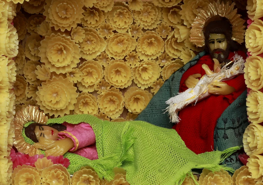 Y la bellísima pieza en cera de Gilberto Huaxín de Cuetzalan, Puebla, en la que la Virgen reposa luego del parto y a su lado José cuida al niño (2020). Se trata de figuras con cera de abeja melipona e indumentaria elaborada en telar de cintura. El portal de Belén es una choza de bambú.