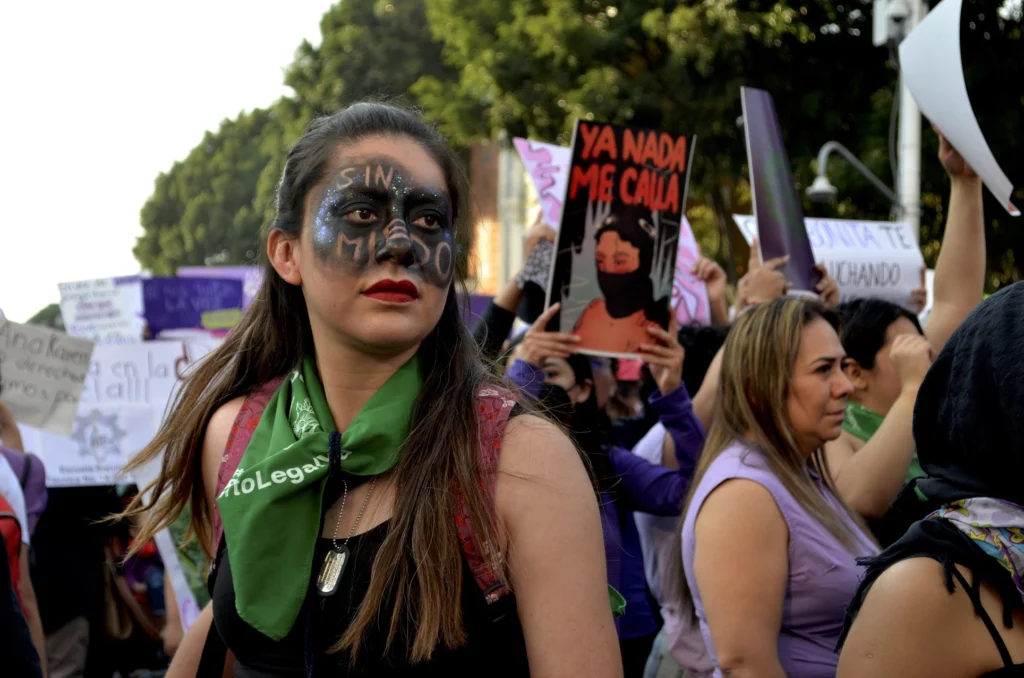 En el Gallito el ambiente era totalmente festivo, porque en un país feminicida como México nos alegramos de estar vivas. Busqué a una de mis primas con quien había quedado de verme, la encontré sentada en una fuente. Faltaba media hora para el arranque de la marcha y el lugar estaba repleto de niñas, adolescentes y mujeres de todo tipo, el Paseo Bravo era morado, verde y negro. Como ni a mi prima ni a mí nos dio tiempo maquillarnos, saqué unos delineadores morado y verde con brillo que compré justo para esta fecha, le puse una línea morada sobre el párpado y unos puntitos verdes en los pómulos, luego me hice unas líneas moradas en los párpados y las rellené con verde. Ahora sí estábamos listas.