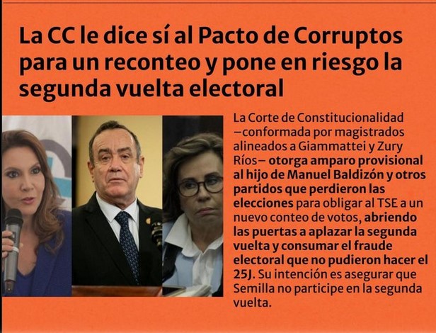 El fraude electoral tal como lo había concebido el bloque en el poder en Guatemala no salió como esperaban quienes lo diseñaron. Se trataba de hacer pasar a una segunda vuelta a una de las tres opciones que debería enfrentar a una segura ganadora de la primera vuelta: Sandra Torres de la Unión Nacional de la Esperanza. El bloque en el poder coloquialmente llamado Pacto de Corruptos hizo tres apuestas: Manuel Conde del partido Vamos, expresión de los intereses del gobierno de turno encabezado por Alejandro Giammattei; Zury Ríos Sosa expresión del ala neofascista del mencionado Pacto de Corruptos a través del partido Valor aliado al Unionista; Edmond Mulet del partido Cabal, expresión de una derecha apoyada por un sector empresarial.