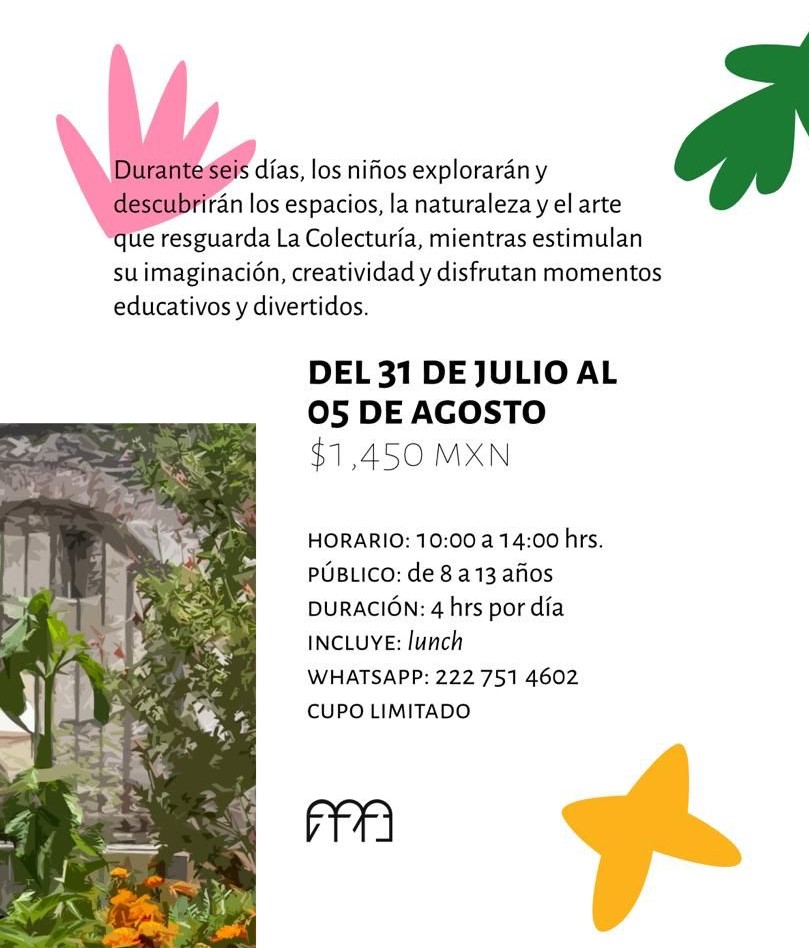 Mundo Nuestro. Naruraleza y arte en La Colecturía, el nuevo espacio cultural en la ciudad de Puebla. Una semana de verano para ninós con el taller “Aprendiendo el buen vivir” en estas vacaciones de verano escolar. Impartido por la artista plástica Anahí Acevedo, el curso está destnado para niños de 8 a 13 años y se llevará a cabo los días 31 de julio al 5 de agosto entrantes.