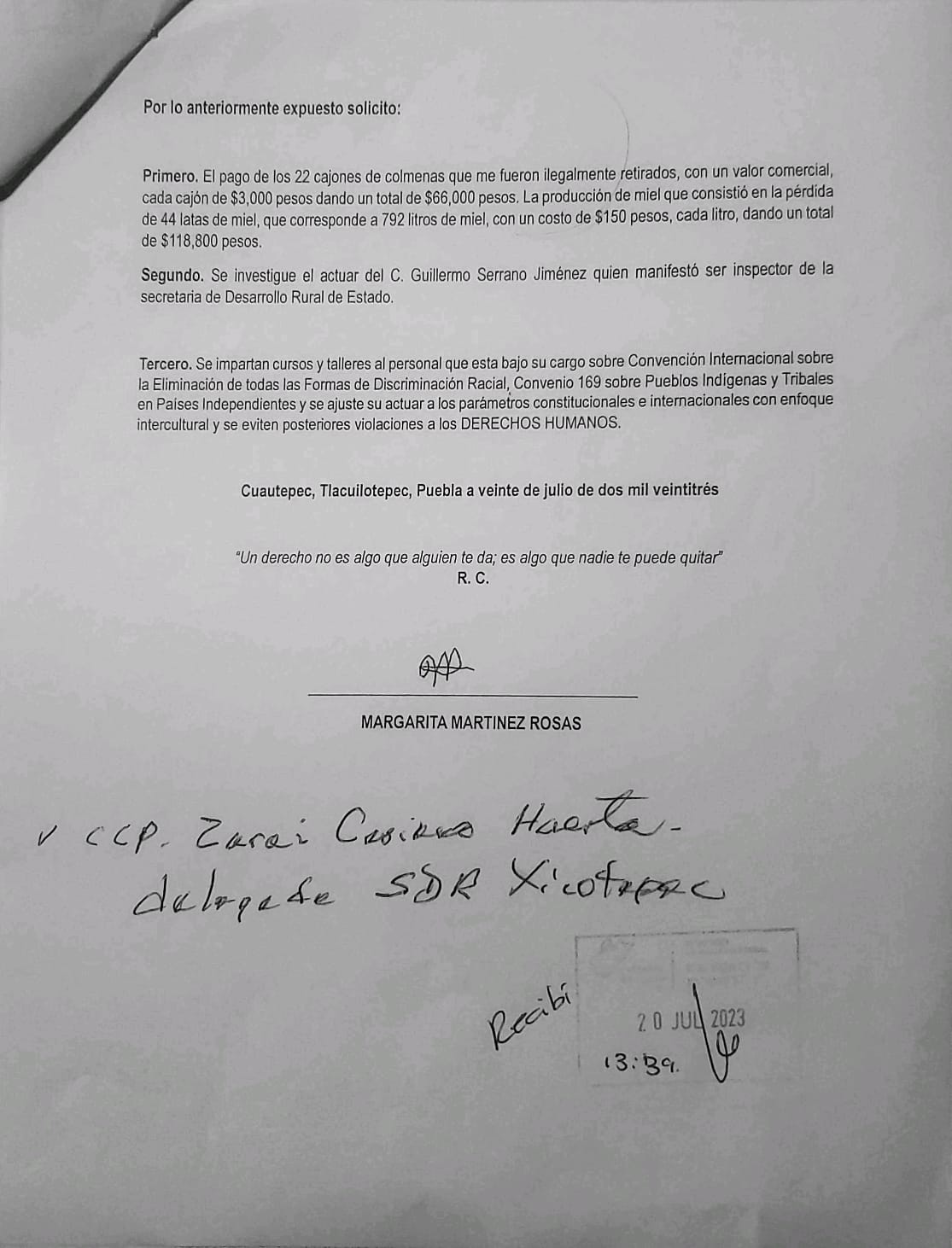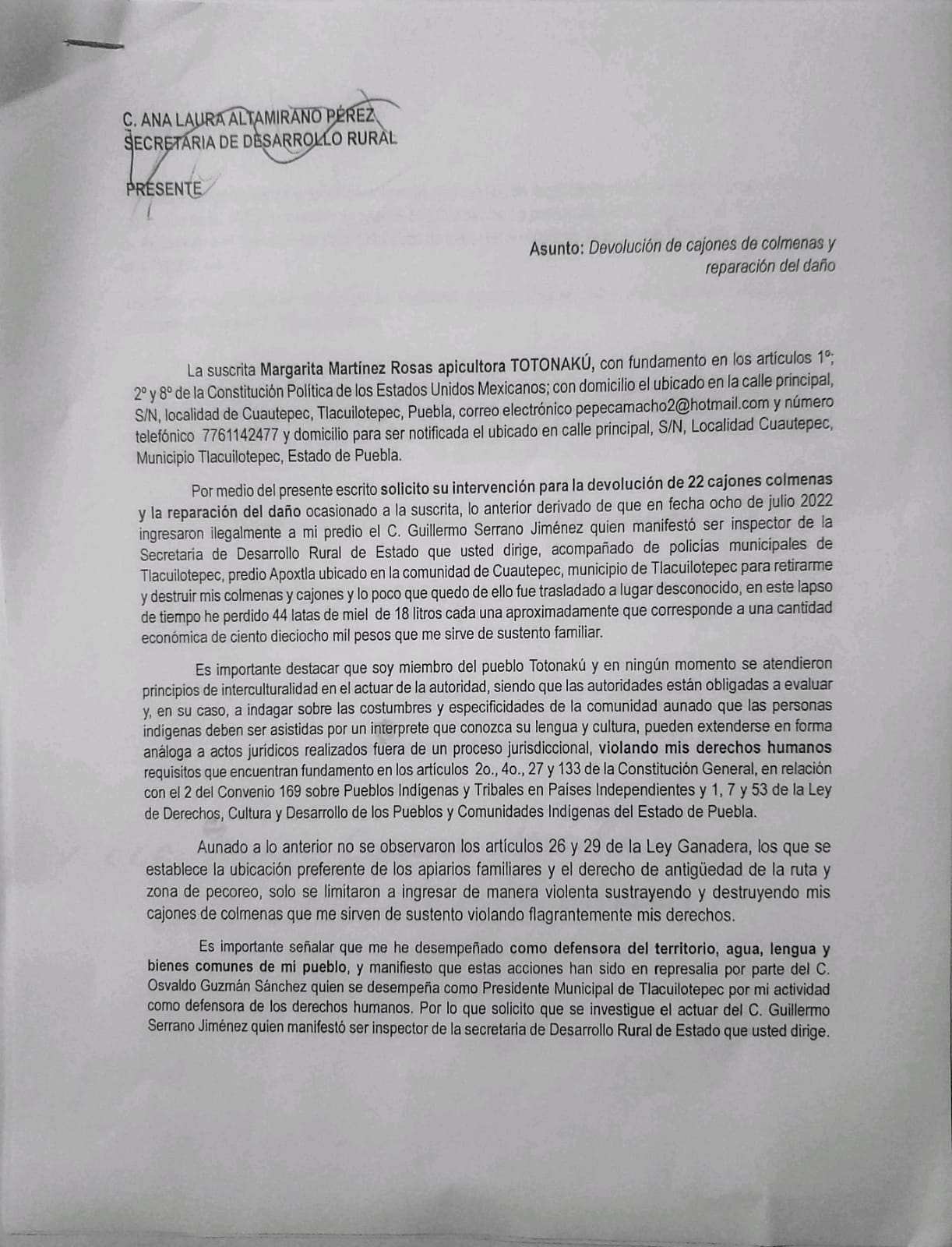 Esta carta de parte de Margarita Martínez, apicultora totonakú, a la Sra.ANa Laura Altamirano, Secretaria de Desarrollo Rural del gobierno del Estado y ex militante de la Coordinadora Nacional Plan de Ayala (CNPA) expone lo sucedido en días pasados en el municipio de Tlacuilotepec por el abuso de autoridad de parte de funciionarios de la Secretaría de Desarrollo Rural del gobierno de Salomón Céspedes y la arbitrariedad a la que fue sometida en perjuicio de su actividad como apicultora. La carta expone su exigencia de justicia.