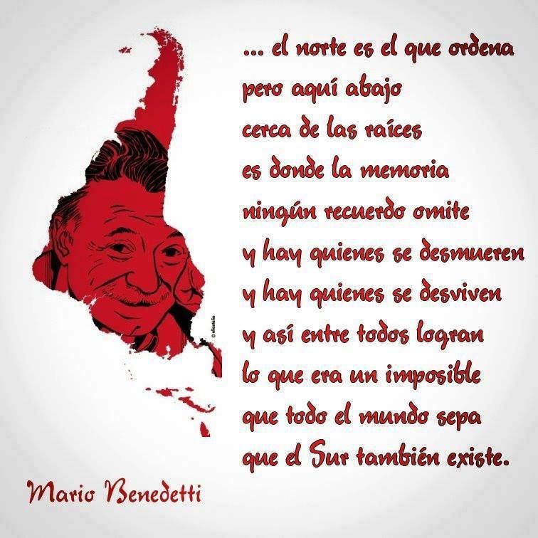 El Sur también existe. En 1986, el gran poeta Uruguayo, Mario Benedetti publicó su libro Preguntas al azar en el que insertó su poema que le da título al presente artículo y que musicalizaría otro gran poeta y cantautor de origen Catalán, Juan Manuel Serrat; El Sur también existe. Es un poema estructurado entre el contraste social y la denuncia del brutal saqueo de los países del norte a los países del sur.