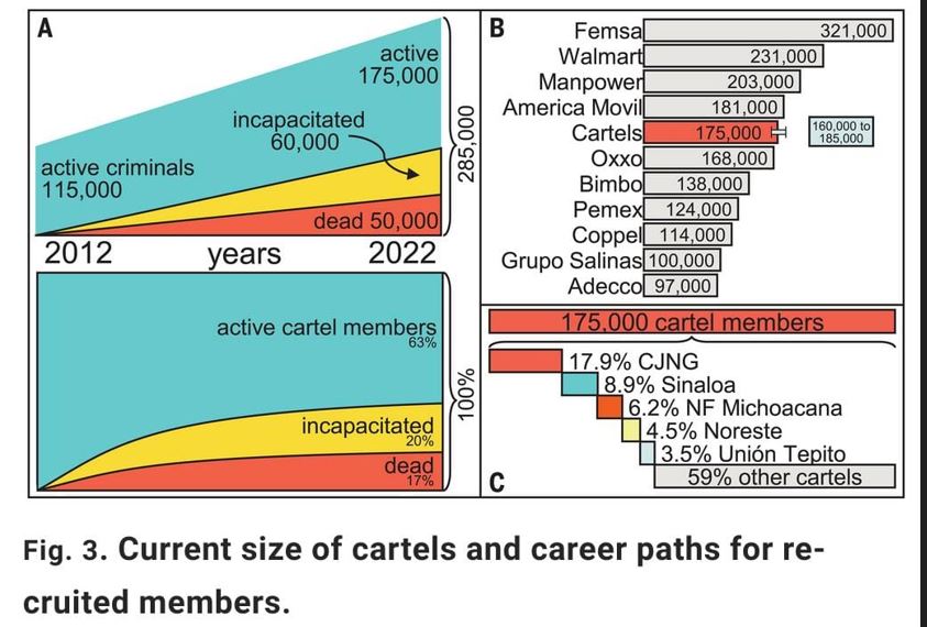 Las bandas criminales de México tienen entre 160 y 180 mil “empleados”, reclutan un promedio de 750 personas a la semana, según la medición de Rafael Prieto-Curiel, Gian Maria Campedelli y Alejandro Hope publicado en Science, y glosada ayer aquí.