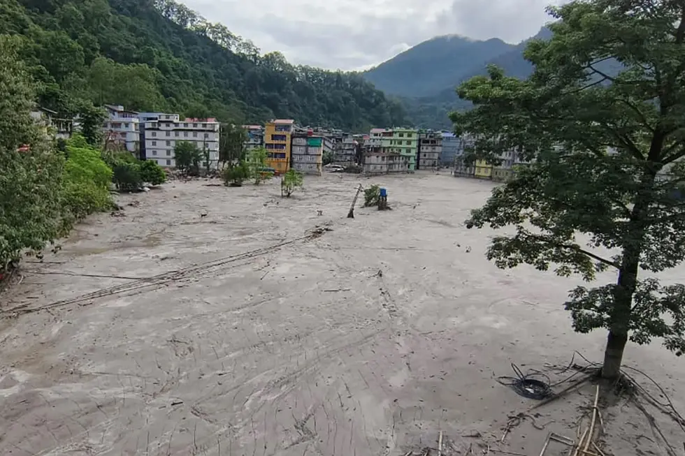 En la imagen, edificios anegados tras las inundaciones repentinas provocadas por las intensas precipitaciones en la localidad de Rangpo, en el estado de Sikkim, India, el 6 de octubre de 2023. Foto tomada del portal de AP)