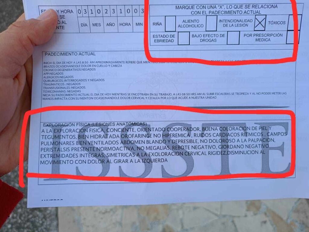 Después de una larga espera le pidieron pasar con el médico José Carlos Cordero Parraguirre, quién siempre –comenta Fátima- se encontró a metro y medio o dos metros de distancia. Relata Fátima que le pidió tomar asiento y que le expusiera lo que le sucedió. Comenzó a relatarle lo ocurrido pero parecía no darle importancia. Mientras ella le relataba él hacía el llenado de su expediente en su computadora. Después se levantó de su asiento y me solicitó que lo esperara, aunque yo aún no terminaba de explicarle lo sucedido. El doctor salió y le preguntó a una persona si estaba libre el área de rayos X. Al regresar el médico al consultorio, le dijo a Fátima que le aplicarían una inyección. Ni el médico ni la enfermera, le mencionaron qué medicamento le iban a administrar. ¿Y el derecho a la información de los pacientes, en dónde queda? En camino a que le sacaran unas placas de rayos X, Fátima se empezó a sentir mareada, Una enfermera le dio a oler una torunda de alcohol. De regreso al consultorio le comentó al médico que se sentía mareada y con mucho dolor de cabeza a lo que él le respondió que era normal. Después de ponerse de acuerdo con una compañera de trabajo sobre qué iban a desayunar, el médico le entregó una receta médica y le dijo que los esperara afuera. Después de esperar al médico una eternidad, Fátima se dio cuenta que en su RT-2 decía cosas inexactas. Después de esperar al médico, entró a su consultorio a reclamarle que todo lo que había puesto en el formato no era cierto, que él había escrito que la coloración de mi piel y tegumentos era normal, sin embargo yo me presentaba con un hematoma en la barbilla y un notorio “chichón”, que también había colocado que revisó mi ritmo cardíaco, mi campo pulmonar y la peristalsis, sin embargo ni siquiera me había colocado el estetoscopio ni en corazón ni en pulmones. Entonces el médico molesto por las observaciones que le acababa de hacer me respondió altanera y arrogantemente: usted sabe qué es peristalsis? A lo que le respondí sí, pues trabajo en el área de la salud. De la clínica la canalizaron al Hospital Regional del ISSSTE en donde la atendió un ortopedista, pero cosas de vivir en el primer mundo y tener servicios de salud como los de Dinamarca, no servía el equipo de rayos X y la volvieron a mandar a la clínica de la CAPU. Con su frustración, enojo y dolor, prefirió irse a su casa.