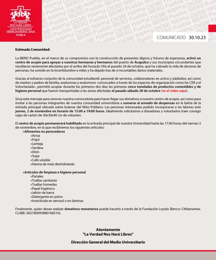 Comunicado IBERO Puebla: Centro de acopio y armado de despensas Acapulco