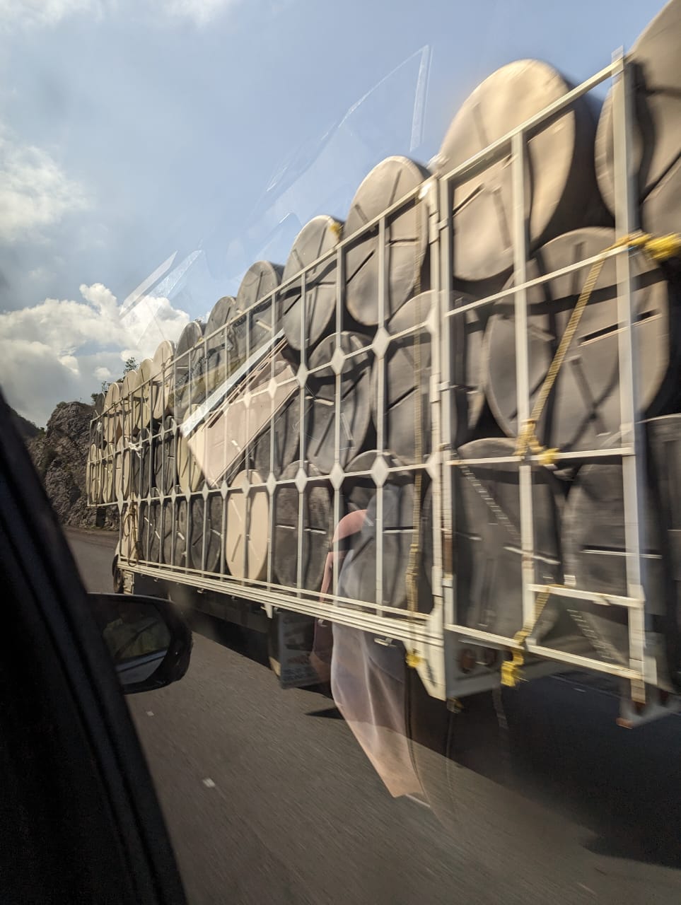 Veo también muchísimos trailers y van con patrullas de seguridad privada. Me dió mucho gusto un trailer enorme de croquetas y otro de helados. En la carretera vemos muchísimos camiones llevando Rotoplast.