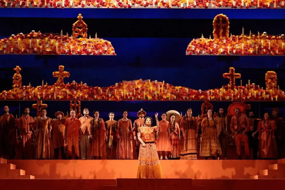 Pese a lo anterior, hay fragmentos que escapan a dicha descripción, como en el primer acto, cuando tres hombres reconocen al famoso pintor –“no tan famoso para olvidarse de los muertos”, dice el libreto– y cantan sobre la manera en la cual los difuntos regresan a visitar a quienes dejaron en el mundo: “Es la fe en su alma, Don Diego, la que los despierta de sus largos sueños”, escuchamos por encima de una tonada que suena a nostalgia, antes de la enumeración de varios de los elementos que conforman la tradición mexicana de muertos: las velas, los senderos de pétalos y los dulces que se ofrecen a esos visitantes incorpóreos.