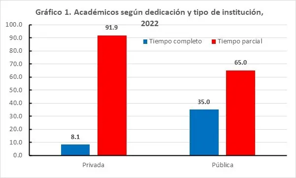 Según los datos de la presentación del proyecto (suponemos que corresponden a 2022), en 930 IES públicas había 158,514 profesores de “tiempo parcial”. Veamos con mayor detalle la información del ciclo 2021-2022. En el gráfico 1, se presenta la información de los académicos en términos de su tiempo de dedicación (que es el establecido en su contratación), se aprecia que en las IES privadas la gran mayoría de profesores son de “tiempo parcial”, en tanto que en las públicas prácticamente representan dos tercios del total de sus académicos.