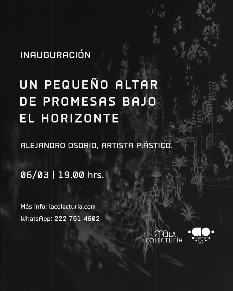 La Colecturía, Centro de Interacción de Saberes, te invita a la inauguración de la exposición de realidad aumentada “Un pequeño altar de promesas bajo el horizonte” del artista Alejandro Osorio. Inauguración: “Un altar de promesas bajo el horizonte” Artista: Alejandro Osorio Fecha: 6 de marzo Hora: 19:00 hrs. Entrada libre Info: https://lacolecturia.com/ WhatsApp: 22 751 4602
