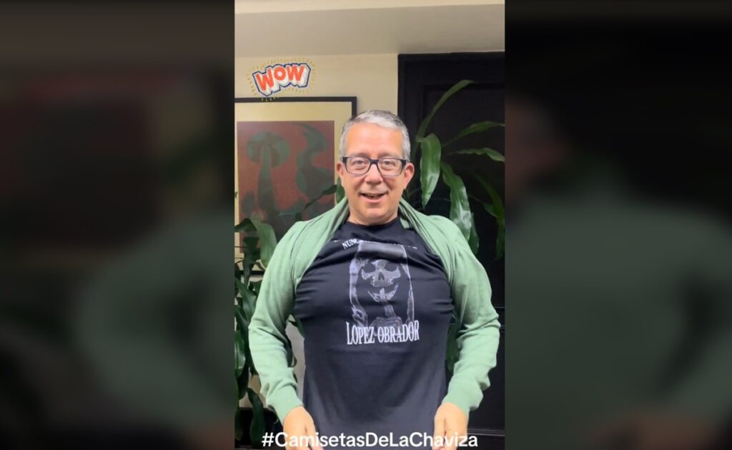 El titular del Sistema Público de Radiodifusión del Estado Mexicano (SPR), Genaro Villamil, en su cuenta de Tik Tok apareció con la playera haciendo publicidad al mensaje.