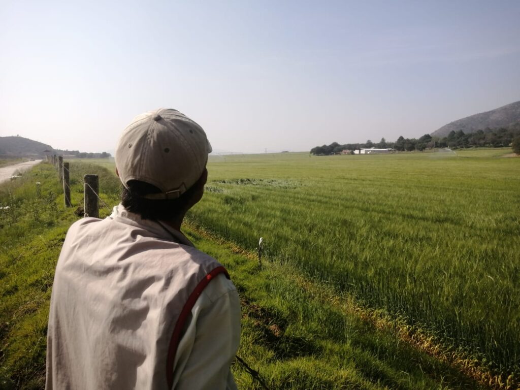 Renato Romero de El Ejido de Ocotepec, aquí en los llanos de la Cuenca de Libres-Oriental, ¿qué sentimiento tiene usted frente a esta tipo de explotación agrícola? Lo que vemos es un campo de trigo casi en espiga, deben ser unas 40 hectáreas, por ahí más o menos, las que se riegan  a todo tren con cañones y pivotes a media mañana del último día de mayo, cuando las tierras de temporal al otro lado del camino se miran resecas a la espera de la lluvia.