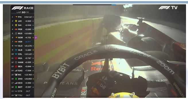 El final es predecible, Pérez defiende su posición en la trayectoria de carrera con todo su enojo, y Sainz intenta regresar al centro de la pista para incomodar a Pérez en la entrada de la curva 3. Se tocan y terminan contra las barreras.
