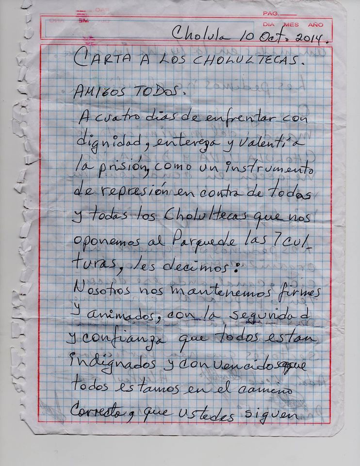 Mundo Nuestro. 13 de octubre de 2014. El conflicto que enfrenta al gobierno de Rafael Moreno Valle –y de su mano, los gobiernos municipales de José Juan Espinosa y Leoncio Paisano–, con los pueblos y barrios de las Cholulas, no empezó con el desalojo de la presidencia de San Andrés en la madrugada del martes 7 de octubre pasado, cuando fueron detenidos el abogado Adán Xicale, su hijo Paul y los hermanos Primo y Albino Tlachi. No inició tampoco con el cierre del Periférico en el crucero con Camino Real la tarde anterior. Ni terminó con el engaño burdo realizado por funcionarios de la Secretaría General de Gobierno el martes 7 por la tarde, cuando de palabra y por escrito prometieron la liberación de los cuatro detenidos. Bien harán en comprenderlo los jueces federales que atenderán este proceso –pues seguramente en esa instancia legal se resolverá el juicio en el mediano plazo–, y una buena ayuda encontrarán en estas dos cartas escritas desde la cárcel por los cholultecas detenidos y consignados con acusaciones que perfilan con todo rigor que el Estado en México sigue haciendo eco del viejo delito de “disolución social” para encarcelar a quienes se oponen a las decisiones arbitrarias de sus gobernantes.