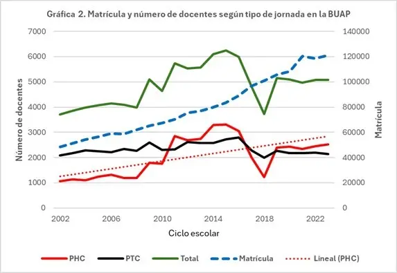 De acuerdo con datos de los Anuarios Estadísticos de la BUAP, en nuestra máxima casa de estudios, entre los ciclos escolares 2002-2003 y 2023-2024, la matrícula estudiantil creció un 150%, pasando de 48,437 a 121,113 alumnos. Sin embargo, el número de docentes solo aumentó un 37%, de 3,701 a 5,081. Mientras los profesores de tiempo completo apenas crecieron un 2% (de 2,088 a 2,133), los de hora-clase aumentaron un 137% (de 1,065 a 2,526), y los de medio tiempo disminuyeron un 2% (de 548 a 422). Estos datos reflejan un aumento en la carga laboral de los docentes, que ha implicado una mayor flexibilidad y movilidad de ellos, pues deben impartir múltiples asignaturas sin una especialización definida.