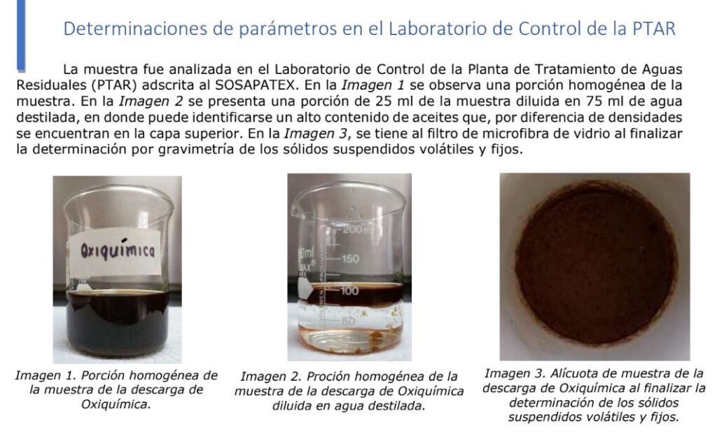 El efluente de la empresa Oxiquímica, SA arroja tan sólo en demanda química de oxígeno (DQO) un total de 28,617.44 miligramos por litro, cuando la norma mexicana más reciente, la NORMA Oficial Mexicana NOM-001-SEMARNAT-2021, establece en 150 mg/lt los límites permisibles de contaminantes en las descargas de aguas residuales en cuerpos receptores propiedad de la nación.