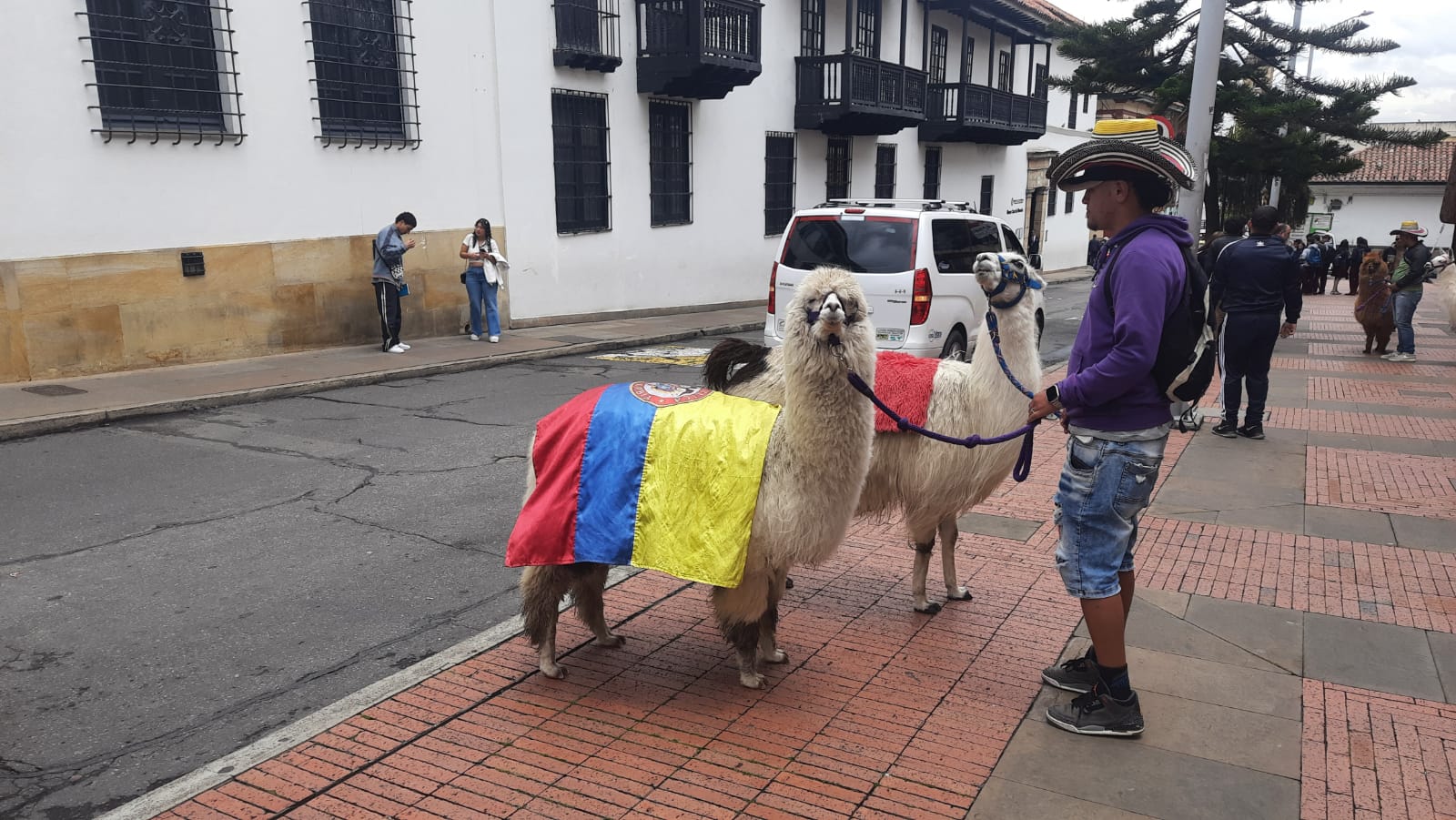 Camino. Más fachadas coloridas, banderas colombianas por todos lados. Estoy en la calle 11, los puestos comienzan a colocarse: ambulantes que van a vender de todo al turismo, gente que vende aromáticas con enormes ollas tipo tamaleras, como Rosalía, que más tarde, en otro momento, me explicaría mucho de lo que ignoro. Llego al Centro Cultural Gabriel García Márquez, a su librería del Fondo de Cultura Económica, a su placa de la SEP, a sus banderas mexicanas. Me siento en una embajada popular. Al paisaje se suman las llamas lanudas: unas con sombreros, otras con banderas, y todas acarreadas por algún sujeto que te ofrece una foto con los animalitos, por cinco mil pesos.