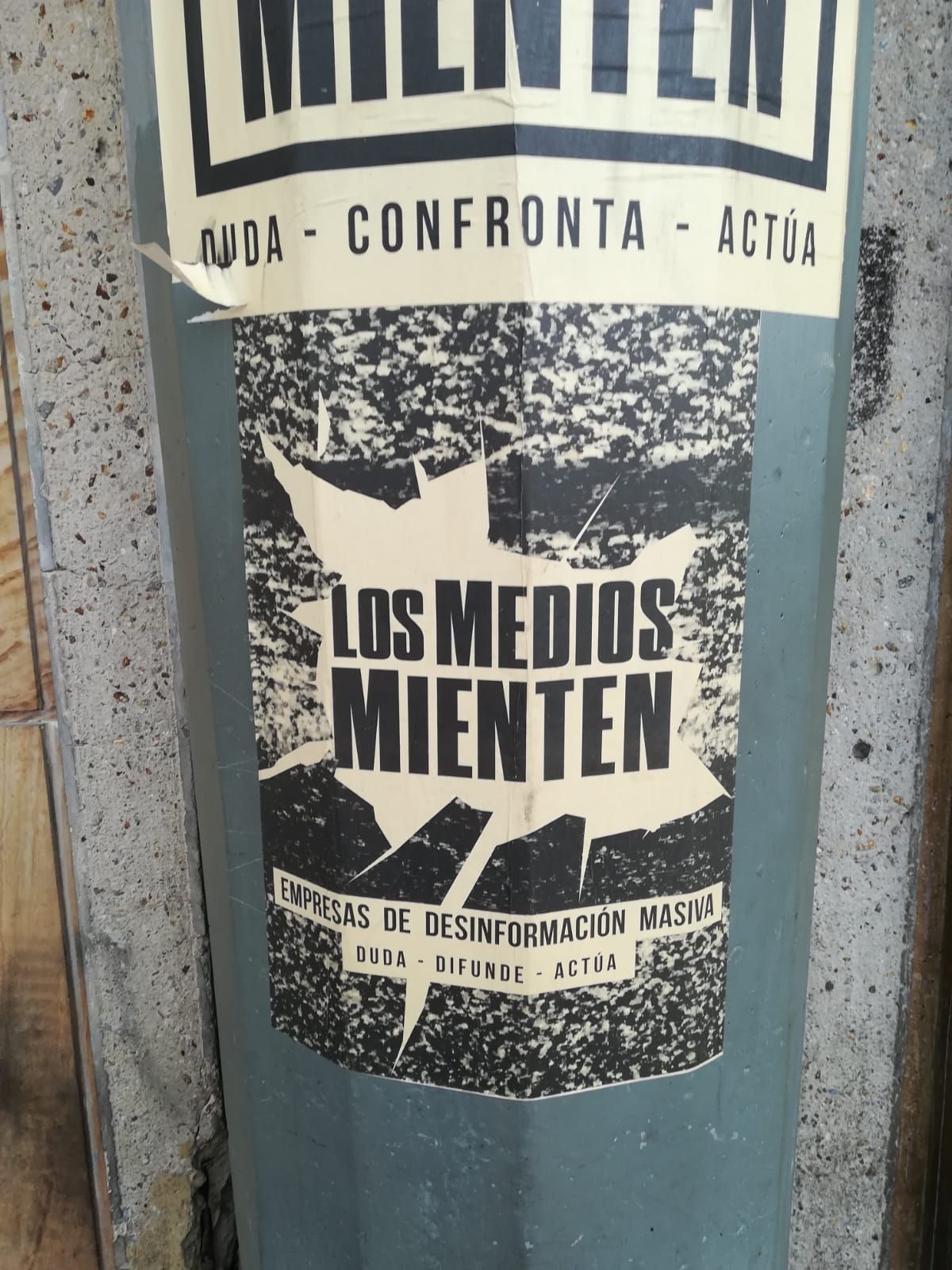 El reloj del viejo edificio del clásico periódico El Tiempo, marca las 3:05, funciona, por instinto me acerco. LOS MEDIOS MIENTEN, acusa un pegote fijado firmemente en la fachada de la construcción. saludo al guardia de la entrada, me cuenta que la redacción y el personal hoy están en otro edificio, que este hoy alberga a una universidad. digno presente para una actividad que a veces parece perder su compromiso con la educación.
