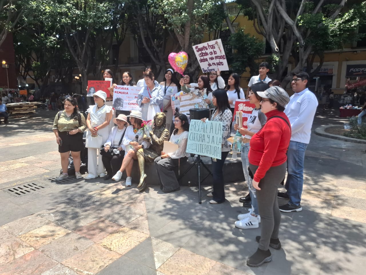 Hasta esta Plazuela de San Luis han llegado estudiantes y maestras del Colegio de Linguística y Literatura de la Facultad de Filosofía y Letras de la BUAP para exigir al Ayuntamiento de Puebla el rescate de la memoria que la ciudad tiene en esta estutua para la figura de Elena Garro. Y en el reclamo la demanda por trasladarla a la Plaza de la Democracia frente al edificio Carolino para su resguardo en el ámbito universitario.