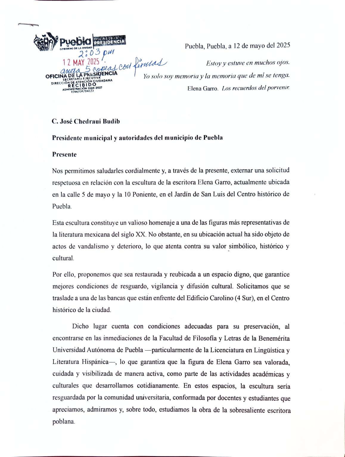 Sentada sobre la jardinera de piedra, la figura grácil en bronce de Elena Garro se encuentra mutilada de una mano, justo la que sostenía uno de sus libros más logrados, quiero pensar en Los recuerdos del porvenr. Otras manos juveniles, las de las jóvenes estudiantes del Seminario de Periodismo cultural y del curso de Géneros periodísticos del Colegio de Lingüística y Literatura Hispánica de la Facultad de Filosofía y Letras de la BUAP, la han limpiado recientemente de las obscenidades que algunos malandrines le han pintado en el rostro. Son las mismas manos estudiantiles que esta mañana del lunes 12 de mayo le han ofrecido un ramo de flores para recordarla como la escritora, periodista, dramaturga, poeta, narradora y guionista que tuvo en la acción de la memoria el territorio para alcanzar los más altos planos de la literatura iberoamericana. Y de paso, dar el primero en el tiempo del realismo mágico latinoamericano con su novela de 1963.