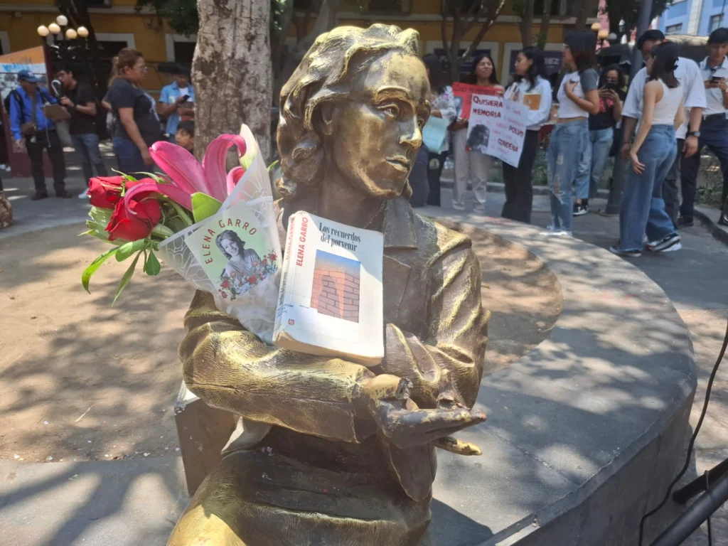Sentada sobre la jardinera de piedra, la figura grácil en bronce de Elena Garro se encuentra mutilada de una mano, justo la que sostenía uno de sus libros más logrados, quiero pensar en Los recuerdos del porvenr. Otras manos juveniles, las de las jóvenes estudiantes del Seminario de Periodismo cultural y del curso de Géneros periodísticos del Colegio de Lingüística y Literatura Hispánica de la Facultad de Filosofía y Letras de la BUAP, la han limpiado recientemente de las obscenidades que algunos malandrines le han pintado en el rostro. Son las mismas manos estudiantiles que esta mañana del lunes 12 de mayo le han ofrecido un ramo de flores para recordarla como la escritora, periodista, dramaturga, poeta, narradora y guionista que tuvo en la acción de la memoria el territorio para alcanzar los más altos planos de la literatura iberoamericana. Y de paso, dar el primero en el tiempo del realismo mágico latinoamericano con su novela de 1963.