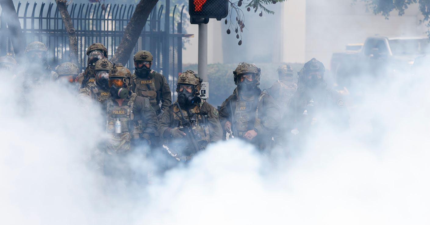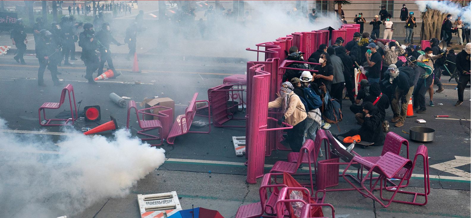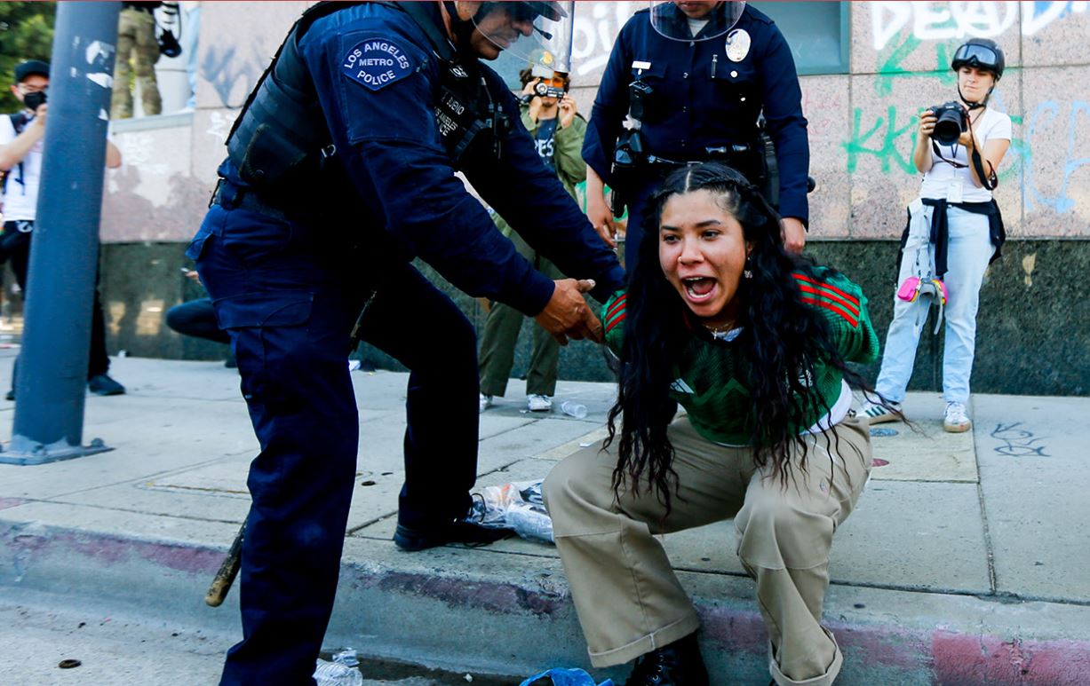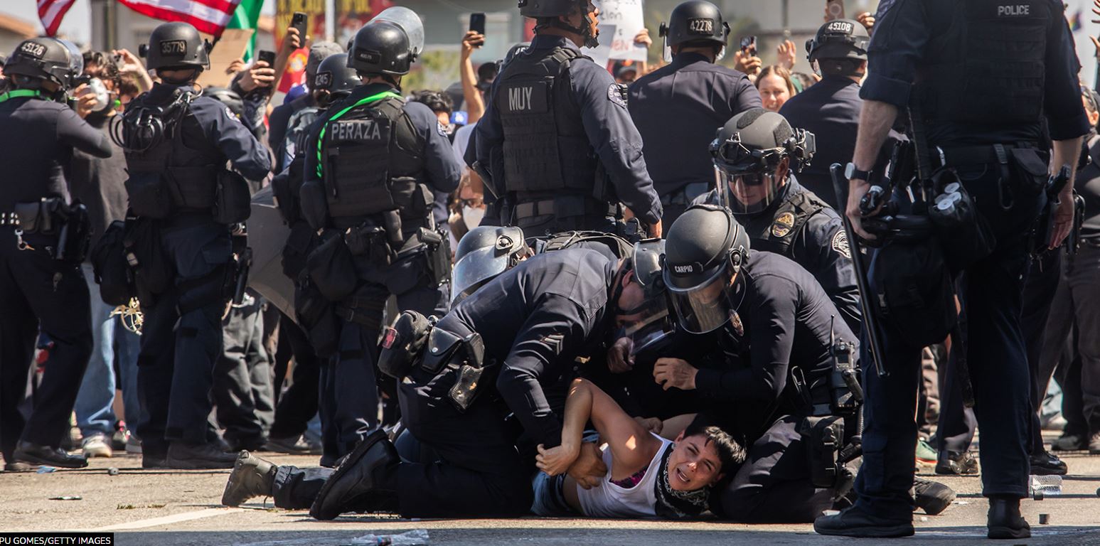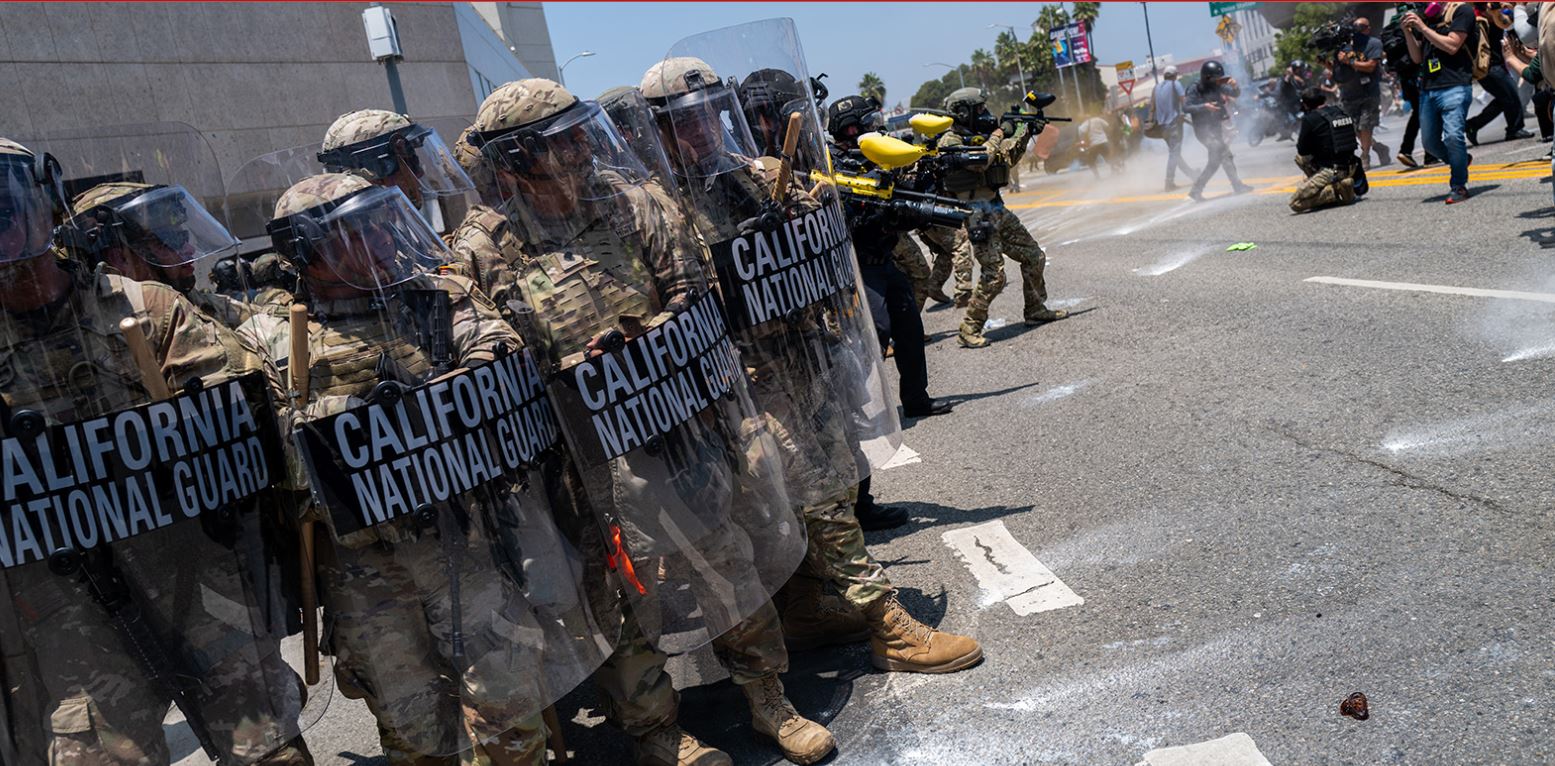 La primera imágen es certera. Dos hombres se miran contra el escudo transparente de la represión policiaca. Por el color de la piel del soldado, bien podría estar del otro lado de la valla que impone el destacamento de la Guardia Nacional que Trump ha enviado a Los Ángeles, la más mexicana de las ciudadas norteamericanas. Pero también la más guatemalteca, la más salvadoreña, la más asiática. La más abierta a la inmigración en todo Estados Unidos.