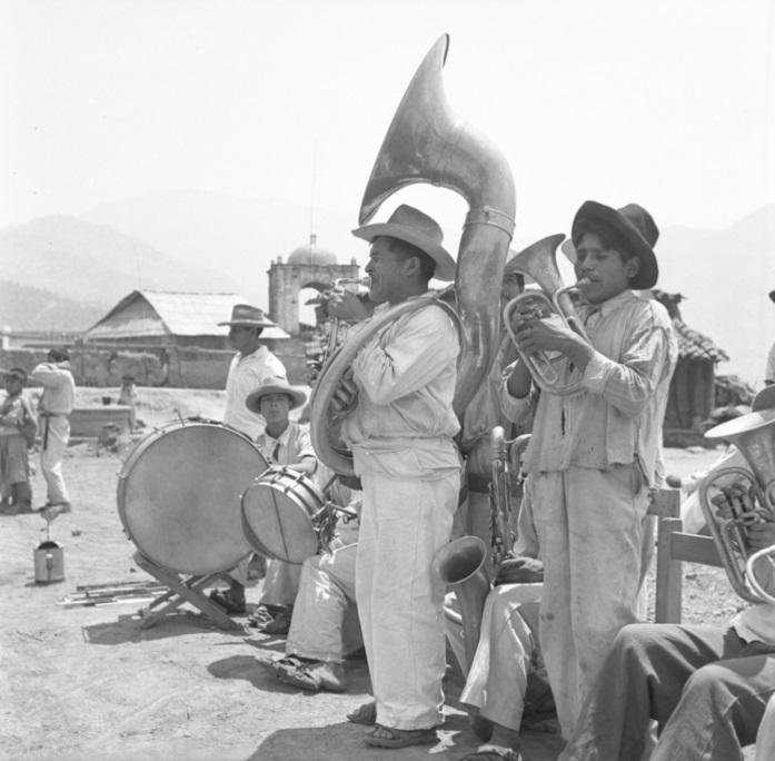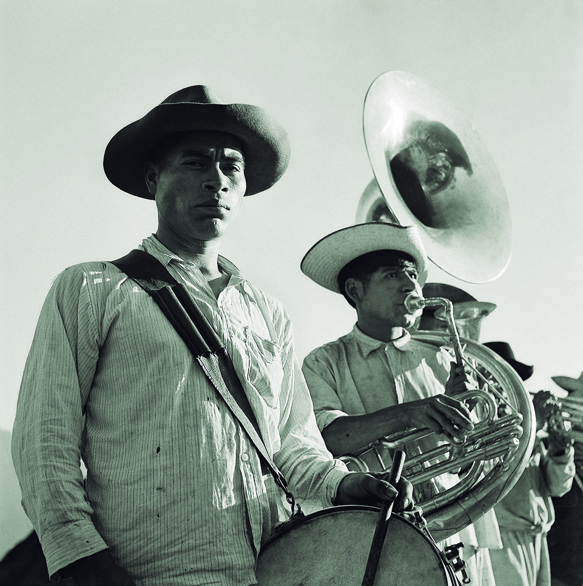 En la serie a la que me he referido, los instrumentos musicales, pero sobre todo los músicos —indígenas— son el centro de las imágenes: los atriles como garras de halcones enterrados en la tierra, las ropas blancas, los pies desnudos, los rostros angulosos de pómulos pronunciados podrían hacer pensar al espectador, que se trata de fotografías tomadas ayer o la semana pasada. No mucho ha cambiado en la zona donde fueron tomadas las fotografías, hace ya setenta años.