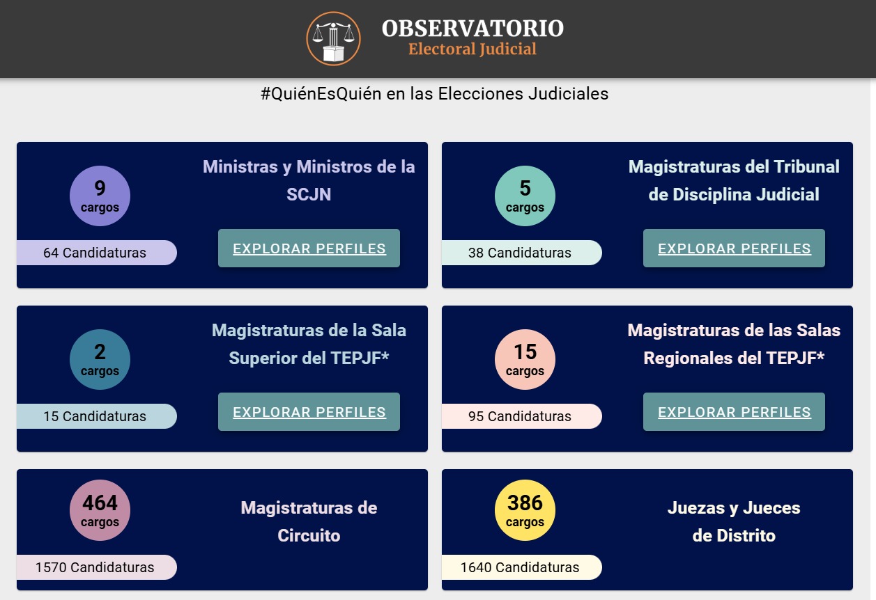 - Para conocer la trayectoria de los candidatos, no fue suficiente la información que el INE publicó en su página sobre los candidatos. Fue necesario complementarla con las investigaciones e información que aportaron algunas organizaciones de la sociedad civil (jóvenes principalmente) tales como el Observatorio Electoral Judicial y Defensorxs. Aunque no fue fácil encontrarlas, pero SÍ había opciones para elegir a personas con la preparación, experiencia y el intachable prestigio público que se requieren para conformar la Suprema Corte de Justicia, el Tribunal de Disciplina judicial y para ocupar las dos magistraturas de la sala superior del Tribunal Electoral del Poder Judicial de la Federación (Imagen 1).