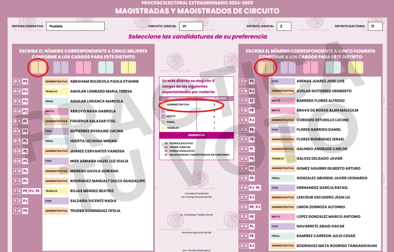 - Como parte de los errores que se cometieron previo a la elección, la boleta para elegir magistrados de circuito (Circuito VI, Distrito Judicial 2, Distrito Electoral 11, correspondiente al estado de Puebla), decía en el recuadro de la parte central que el total a elegir de magistrados en materia administrativa (color anaranjado) era de tres, sin embargo, solo aparecían dos casillas de ese color (Imagen 2).