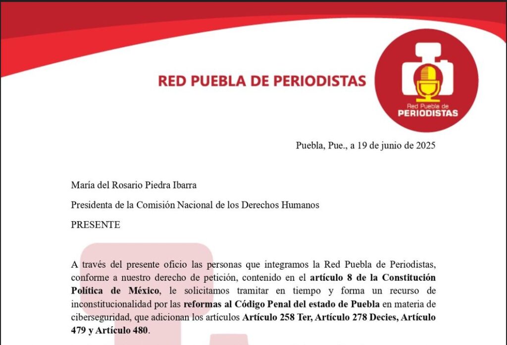 Este es el comunicado en el que la Red Puebla de periodistas solicita formalmente a la Comisióon Nacional de Derechos Humanos @CNDH promover un recurso de inconstitucionalidad por las recientes reformas aprobadas al Código Penal de Puebla en materia de ciberseguridad. Con copia para @CongresoPue @artemisalaura @armentapuebla_ @article19mxca