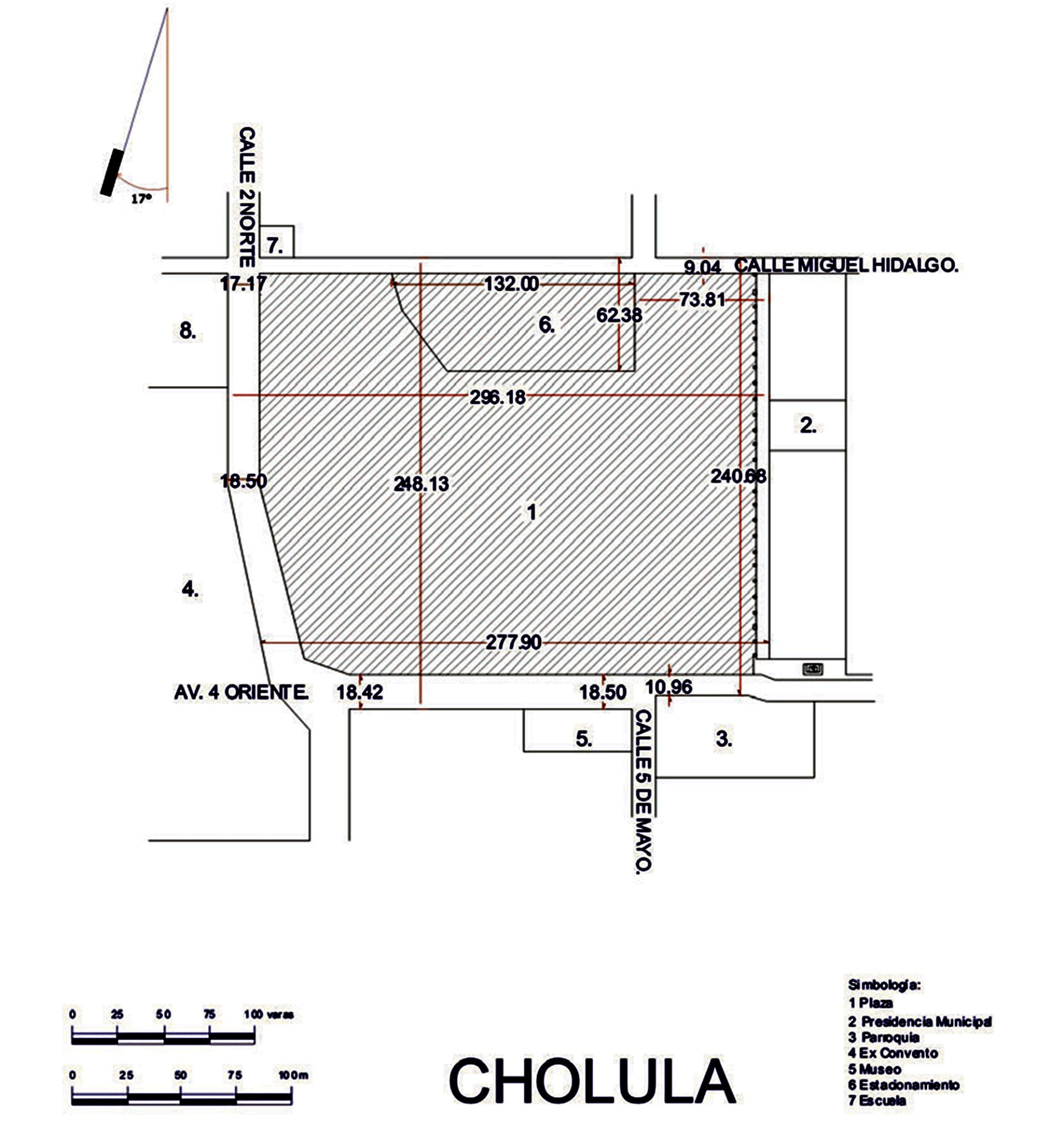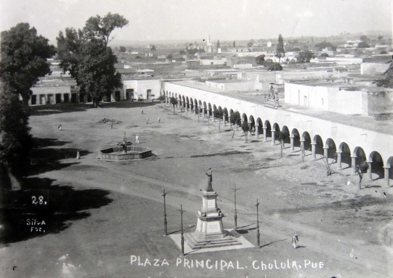 La Gran Plaza de Cholula era cívico religiosa y mercantil, por ser la ciudad sagrada del Altiplano Central. A la llegada de los conquistadores españoles, Cholula fue transformada con el inicio de la tributación a la Corona española en 1535. Al recibir el título de ciudad por la real cédula el 27 de octubre de 1537 se produjo la mayor transformación, dictándose la traza reticular de la nueva ciudad colonial en 1542; en 1543 Juan Francisco, maestro Alarife, midió “la legua de tierra por cada viento, media cada una de llano, desde el centro e iglesia de dicha ciudad”, esta área comprendía la casa de los tecpan y de los pili, para dar a la ciudad la forma de una ciudad renacentista, congregando a los indígenas, dándoles solares, para someterlos a la traza reticular, emprendida no por el Estado sino por la Iglesia, para la conversión de los indígenas.