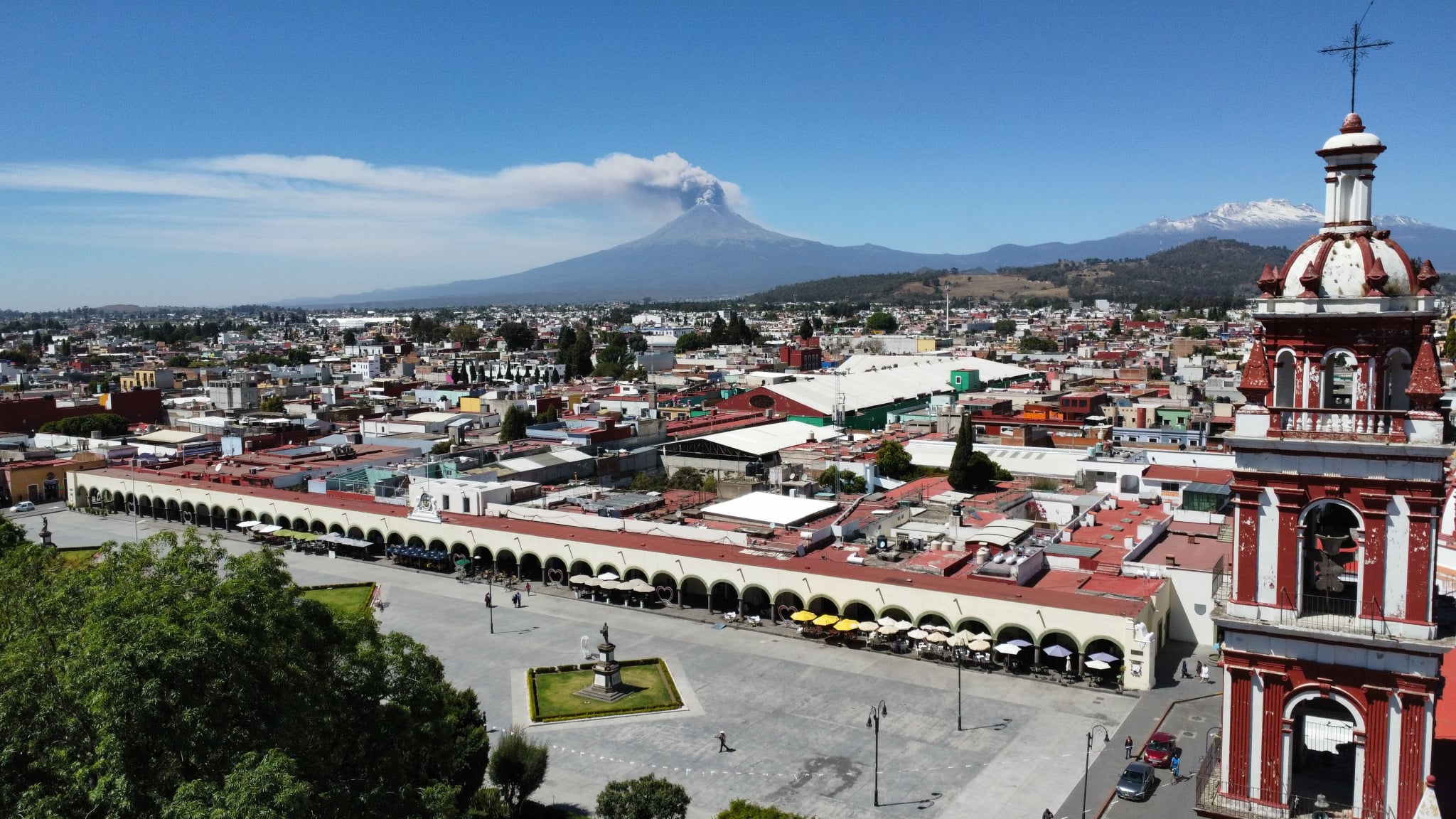La plaza de la nueva ciudad de Cholula no es un cuadrángulo, sino más bien un trapezoide, aglutina los edificios más importantes, tanto civiles como religiosos. Al oriente el convento de San Gabriel; al poniente las casas reales, precedidas por los imponentes portales; al norte la parroquia de San Pedro; y al sur casas particulares y comercios.