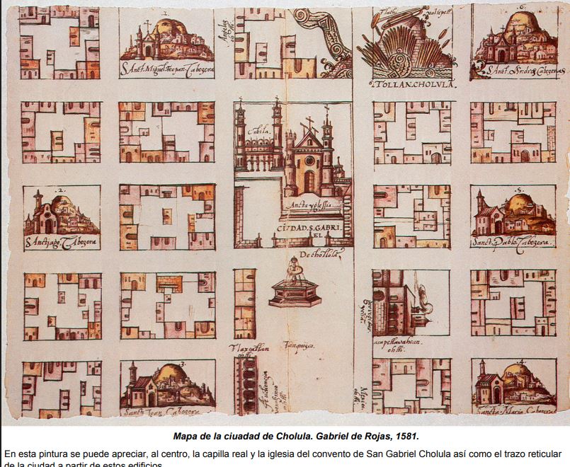 El mapa que acompañó a la Relación Geográfica de Gabriel de Rojas representa al cuerpo de la ciudad de forma imaginaria, no es más que una representación esquemática de la ciudad, a la que agregó elementos como el Tlachihualtepetl, la cabecera, el topónimo, los caminos, la ubicación de la casa del corregidor, la audiencia y el tianguis. Kluber concluyó que “cada manzana del mapa de 1581 corresponde a seis o nueve manzanas modernas trazadas en una cuadricula de 1581 y se cambió el eje largo de cada manzana cuando las grandes manzanas se subdividieron; también señala que la simetría de las cabeceras que se observan en el mapa no es real, al representar a las cabeceras observamos seis iglesias junto al cerro, templos que representan la edificación antigua de las iglesias de cada cabecera o barrio, observando errores en la ubicación de la iglesia de San Miguel, que se encuentra situada a una cuadra al norte del convento franciscano, en lugar de atrás del convento, dividiendo y desviando el camino a Puebla, mismo que pasaba junto a la pirámide. Un error más es la ubicación de San Andrés: no se ubicaba en la cuadra siguiente a San Miguel, sino entre San Miguel y San Andrés, mediando ocho manzanas, y San pablo no se encontraba a una cuadra del centro de Cholula, sino a seis cuadras de distancia del centro de Cholula.