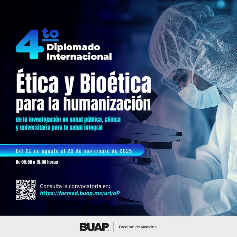 4to. Diplomado Internacional Ética y Bioética para la humanización de la investigación en salud pública, clínica y universitaria para la salud integral. Modalidad virtual. Del 02 de agosto al 29 de noviembre 2025. Consulta la convocatoria: https://facmed.buap.mx/url/oP