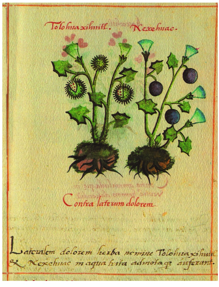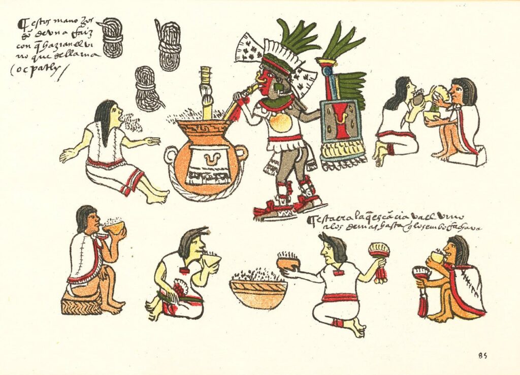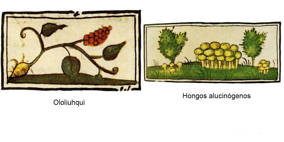Las semillas de olioluqui, coaxihuitl o Manto de la Virgen (Convolvulus corymbosus L.) y tochtetepo, tlitlitzin (Ipomoea violácea L.) contienen grandes cantidades de amida y de hidroxietilamida del ácido lisérgico (LSD) por su estrecha relación con la dietilamida del LSD, se utilizaban para comunicar con espíritus que pertenecían al mundo de lo sagrado. Favorecen el estado de trance, se utilizaban molidas en polvo, ingiriendo agua para inducir ilusiones visuales, euforia, alteraciones amnésicas y somnolencia. El lirio de agua (Castalia ampla Salisb.), una planta asociada a la muerte, los dioses, el inframundo y la otra vida, se empleaba para prácticas adivinatorias y de éxtasis, comunicarse con las deidades, las fuerzas de la naturaleza y convertirse en la personificación del maíz y la lluvia. El pipiltzintli (Salvia divinorum Epling & Játiva) receptor del opioide kappa; sus efectos son intensos, favorece introspección placentera, falta de atención a lo circundante, mayor sensibilidad a los estímulos luminosos y sonoros; utilizado para prácticas adivinatorias; sus efectos nocivos: disminución de la presión arterial y cefalea. La hierba que señala Francisco Hernández para fermentar la bebida es el ocpatli o cuapatli (Mimosa angustissima Mill.), se utilizaba para incrementar su fuerza embriagante del pulque, es fuente de digitoxina, estimulante del corazón, lo que determinaba que fuera más enérgico el efecto de la bebida.