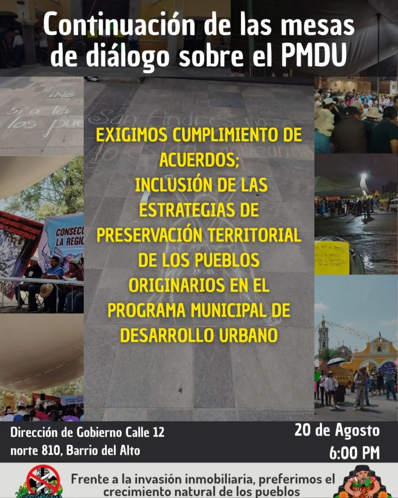 Esta orden en el seguimiento de la sentencia que ampara a Tlaxcalancingo contra el Programa Municipal de Desarrollo Urbano y las Bajadas del Periférico se da, en el contexto del seguimiento a las mesas de trabajo entre el Ayuntamiento de Guadalupe Cuautle, los pueblos originarios de San Andrés Cholula y el Gobierno del Estado sobre incluir las Estrategias de Preservación Territorial de los Pueblos Originarios en el Programa Municipal de Desarrollo Urbano (PMDU).