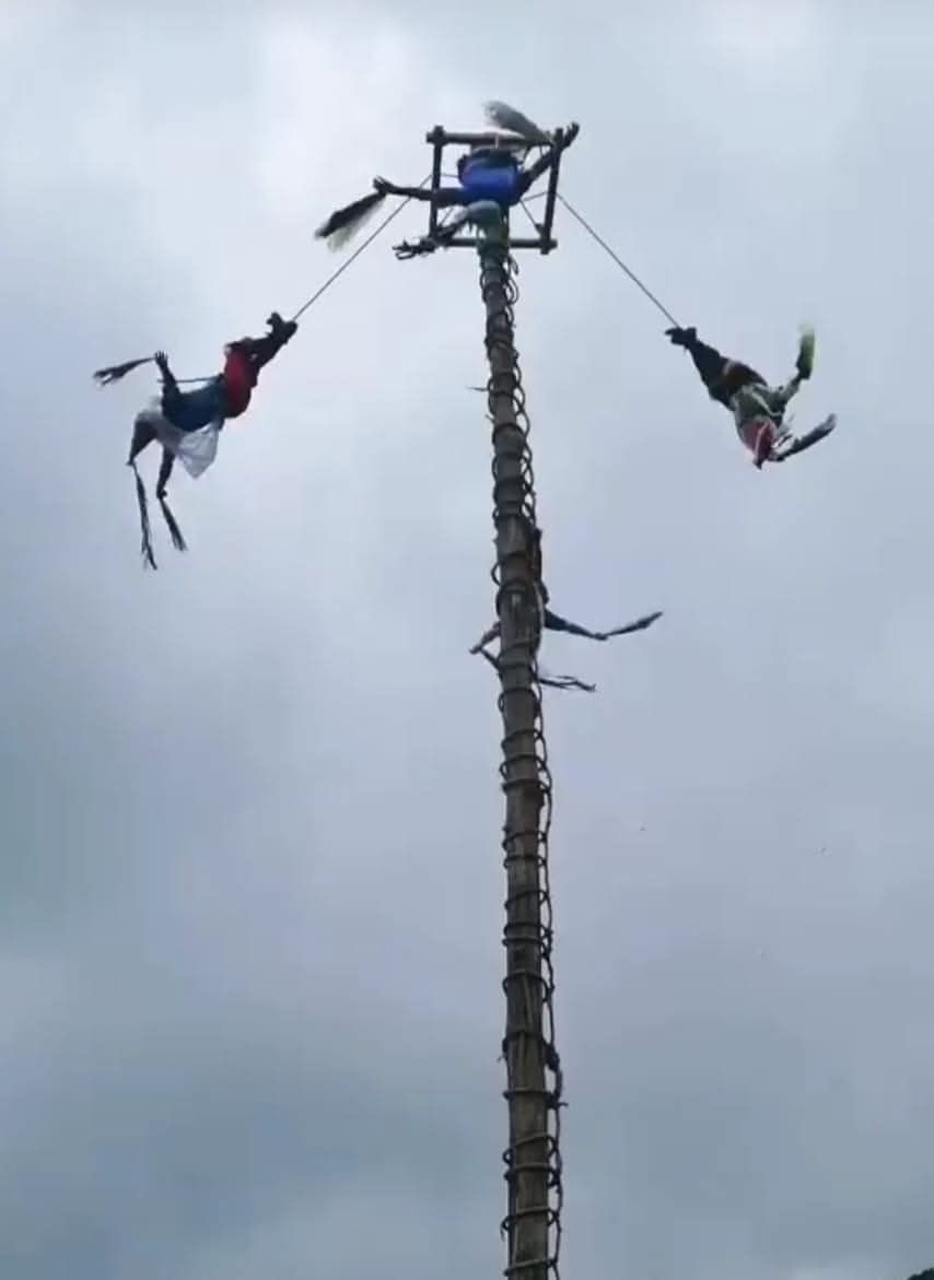 El axis mundi simbolizado en el árbol desramado, descortezado y plantado en el centro de la plaza donde se realiza el ritual, conecta, decíamos al principio, los tres niveles de existencia, el celeste de las deidades, el terrestre humano y el inframundo de los antepasados. En su parte más alta el palo tiene una pequeña plataforma donde se lleva a cabo el acto culminante de la ceremonia, que es la invocación a los seres celestiales, el sol, diversas deidades, santos, espíritus auxiliares que trabajan con los vientos, las nubes y la lluvia, y un dispositivo móvil que permite el descenso en círculos de los danzantes, que representan a esas entidades espirituales que desde lo alto vienen a fecundar la tierra, a hacer posible la vida desde su gestación en el subsuelo con la siembra de las semillas, principalmente el maíz, que resurge año con año desde tiempos inmemoriales.