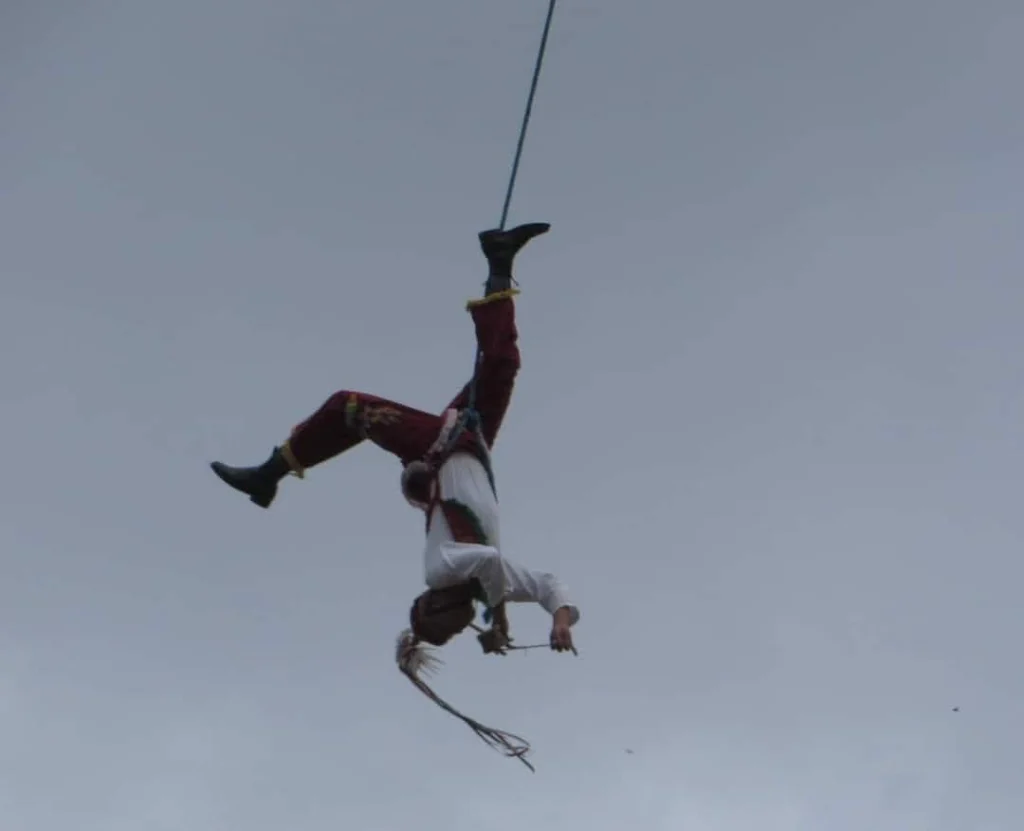 El axis mundi simbolizado en el árbol desramado, descortezado y plantado en el centro de la plaza donde se realiza el ritual, conecta, decíamos al principio, los tres niveles de existencia, el celeste de las deidades, el terrestre humano y el inframundo de los antepasados. En su parte más alta el palo tiene una pequeña plataforma donde se lleva a cabo el acto culminante de la ceremonia, que es la invocación a los seres celestiales, el sol, diversas deidades, santos, espíritus auxiliares que trabajan con los vientos, las nubes y la lluvia, y un dispositivo móvil que permite el descenso en círculos de los danzantes, que representan a esas entidades espirituales que desde lo alto vienen a fecundar la tierra, a hacer posible la vida desde su gestación en el subsuelo con la siembra de las semillas, principalmente el maíz, que resurge año con año desde tiempos inmemoriales.